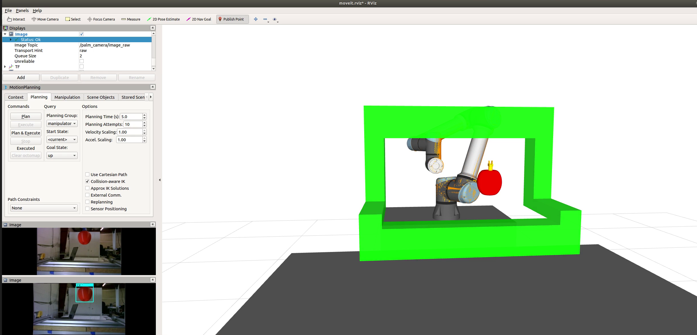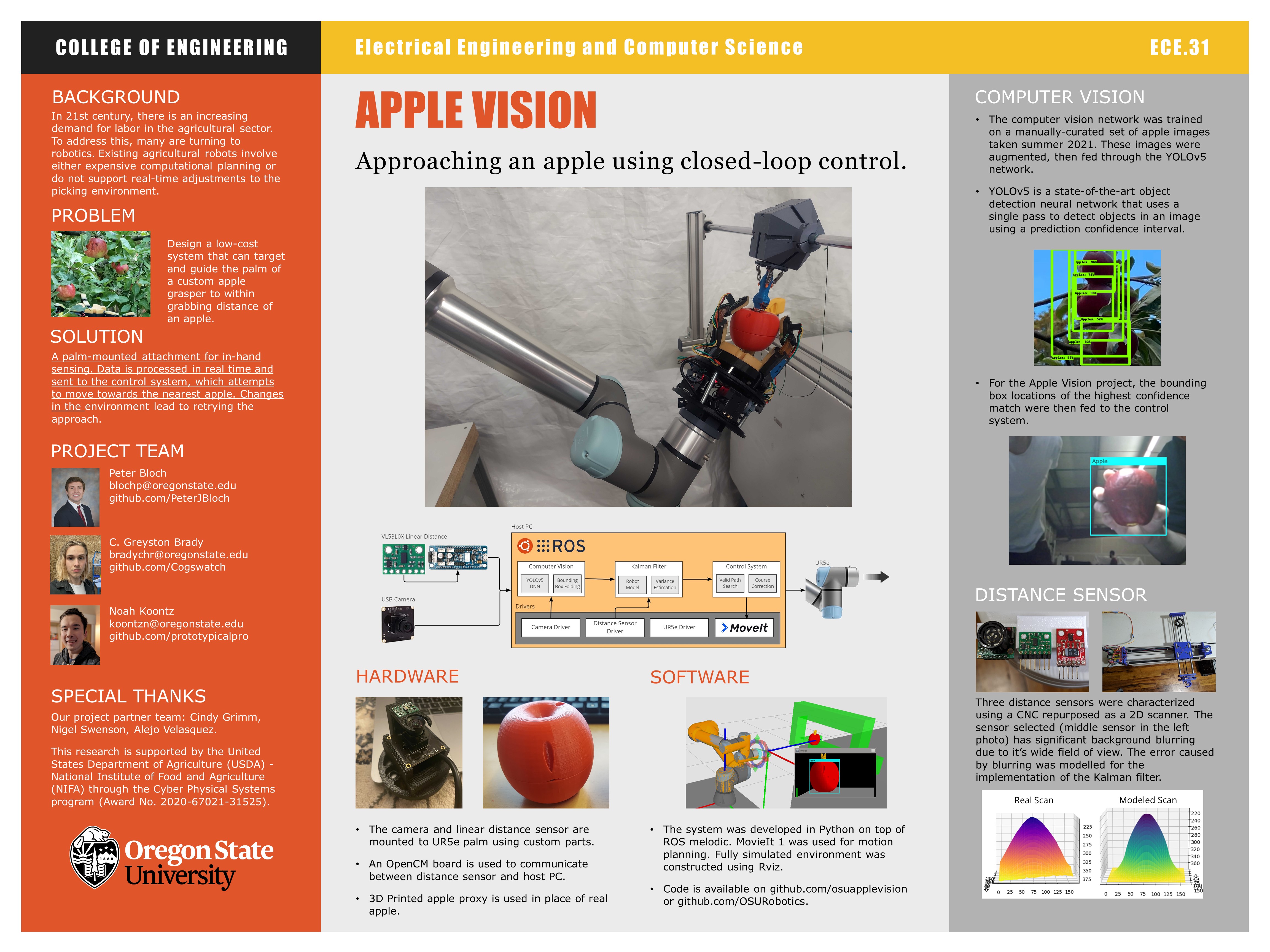 In 21st century, there is an increasing demand for labor in the agricultural sector. To address this, many are turning to robotics. Existing agricultural robotsĀ involve either expensive computational planning or do not support real-time adjustments to the picking environment. Apple Vision designed a low-cost system that can target and guide the palm of a custom apple grasper to within grabbing distance of an apple. Data is processed in real time and sent to the control system, which attempts to move towards the nearest apple. Changes in the environment lead to retrying the approach.