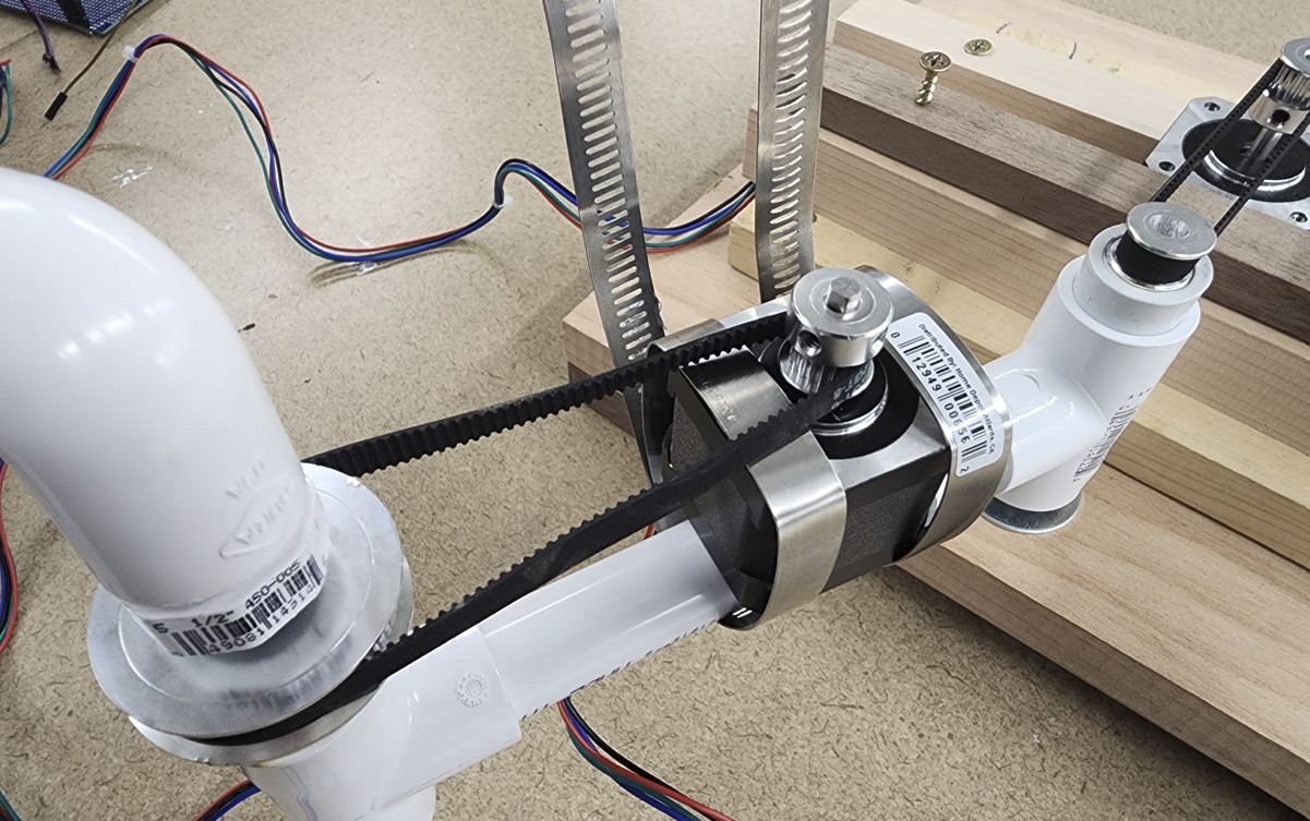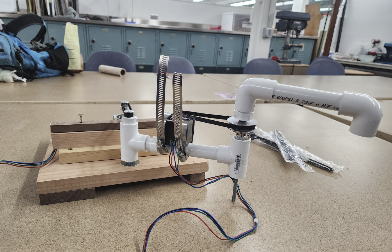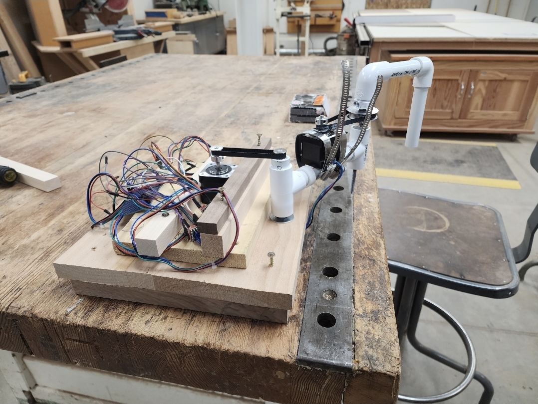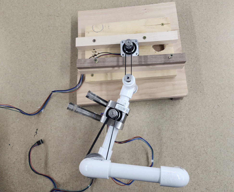 This is a Two-Axis Robotic Arm pen plotter designed with SCARA topology. User-defined inputs, such as basic shapes and simple vector drawings, are uploaded via a Graphical User Interface (GUI) and plotted on a 8.5x11'' drawing surface via a writing utensil. The user-defined inputs are transformed into G-code via the system's software. These G-code commands are then transferred onto the Arduino Uno microcontroller board. After performing calculations given the data, the microcontroller sends out digital signals to the device's two motor drivers that adjust the current through and direction of rotation of the device's two NEMA-17 motors. Significant accomplishments include the robust nature of the system chassis; a custom-coded web-loaded GUI; and external power to the Arduino via a voltage regulator. Areas of improvement and possible expansions include a 24V 2A power supply capable of being hooked up to wall power to power the motor drivers; a larger, custom PCB to house all system components cleanly; and a pen protraction and retraction system.