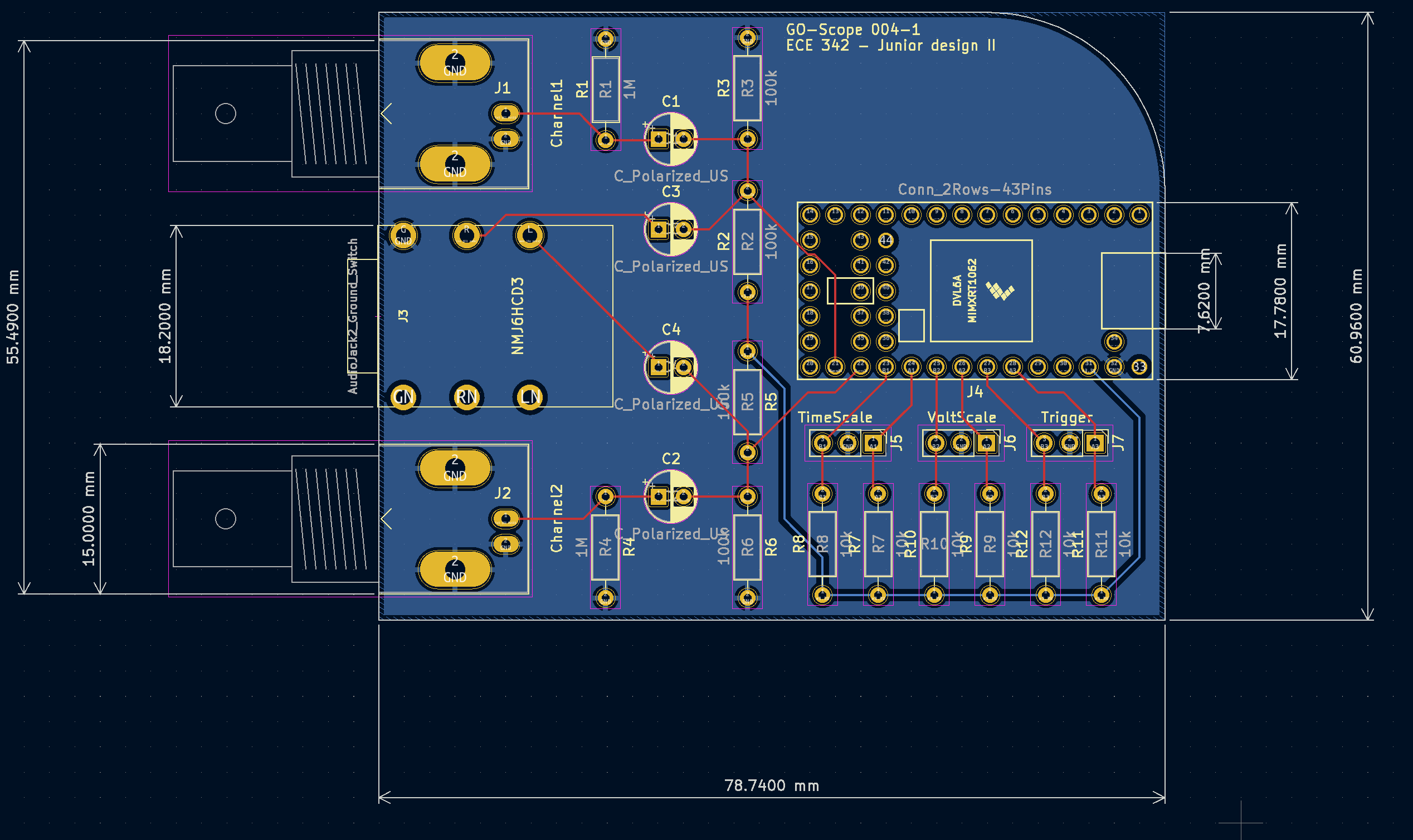 The GO-Scope is a small, portable oscilloscope with 2 channels and 100kHz sample rate. Capable of visualizing signals through Pure Data and saving data to a .wav or .csv file. Inputs are 2 BNC oscilloscope probe ports and a 1/4" stereo audio jack. Voltscale, timescale and trigger level are all externally adjustable and instantly update the display. More than anything, GO-Scope is a lifestyle. It's an understanding that an oscilloscope does not need to be a bulky box that collects dust in a lab. It's a device that goes where you go, and gives you the data that you truly care about; without breaking the bank. Special thanks to Alaina Keller for her help in the construction of the final design.