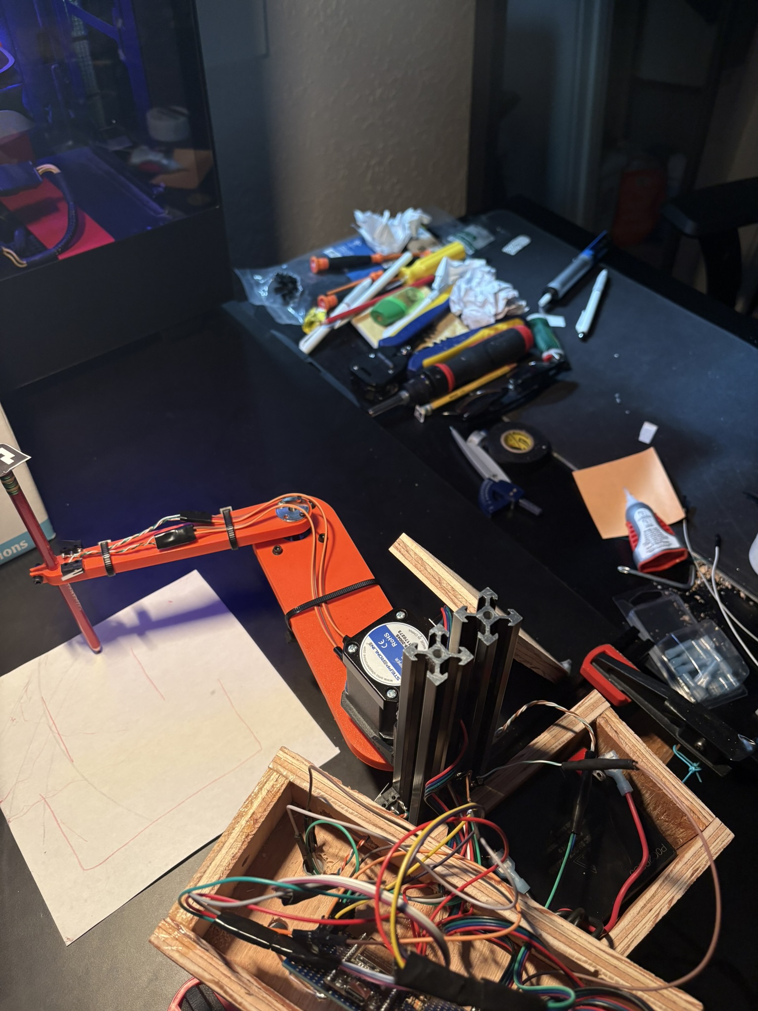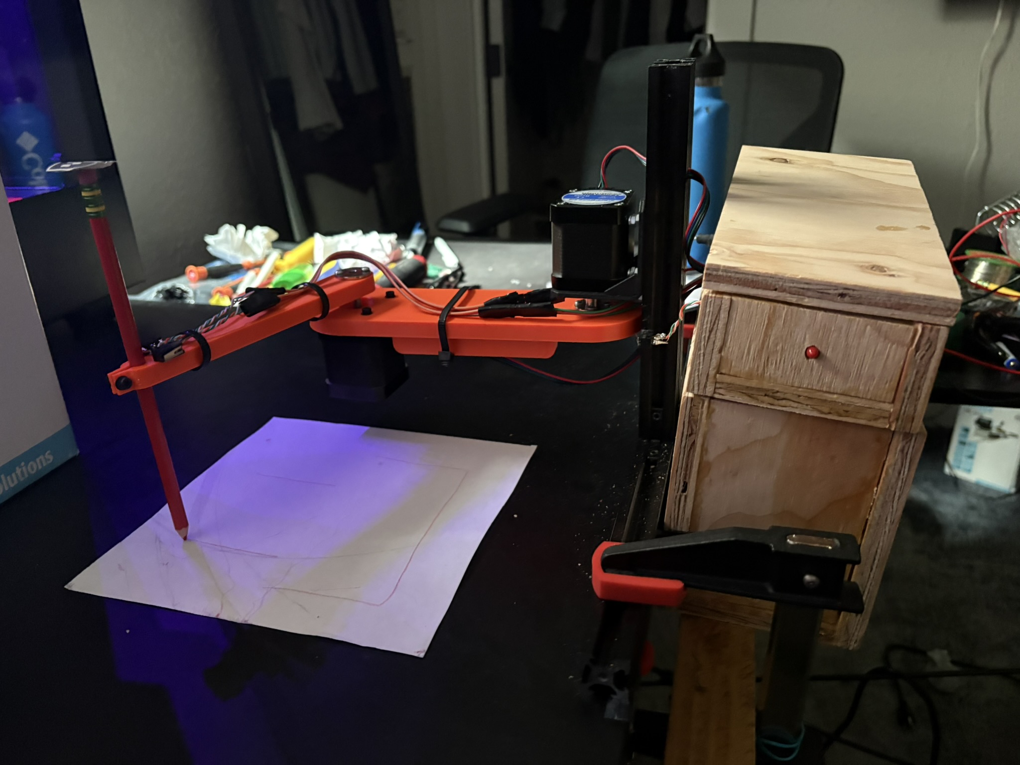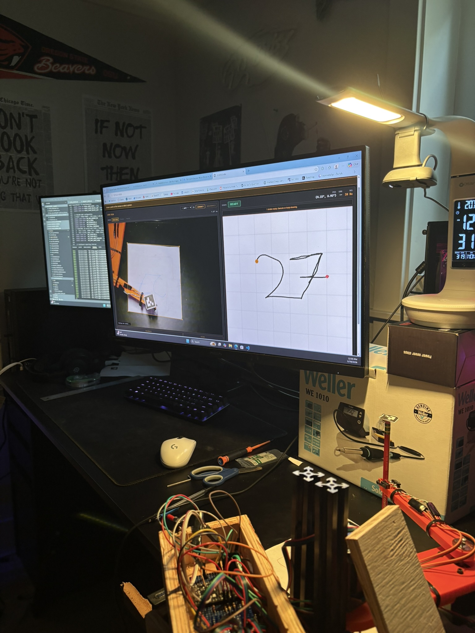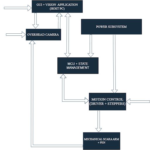 SCARAScribe is a two-axis SCARA robotic arm designed to reproduce user-drawn strokes onto paper with guaranteed single-stroke accuracy, validated through real-time computer vision feedback. The system enables a user to draw a continuous stroke on a web-based canvas, which the arm then physically reproduces on a 7.25" square paper workspace while continuously monitoring execution quality. The system integrates an ESP32 microcontroller driving TMC2209 stepper motor drivers, a Python FastAPI backend with OpenCV-based vision processing, and a browser-based GUI connected over WebSocket. ArUco marker calibration provides sub-millimeter workspace registration, while a multi-source fault detection pipeline (vision-based paper boundary monitoring, cross-track deviation analysis, StallGuard motor stall detection, and hardware limit switches) ensures the arm halts immediately if drawing accuracy is compromised. Key accomplishments include the implementation of a deterministic 8-state machine with a universal recovery hub, a modular three-layer architecture enabling independent testing of vision, motion, and firmware subsystems, and an accuracy reporting system targeting ER-2 compliance (< 0.25" deviation on 10" lines). The primary challenge was hardware and our choice not to make a custom PCB, this led to some major pitfalls down the line, and we plan on implementing a v2 that addresses this (along with z-axis lift).