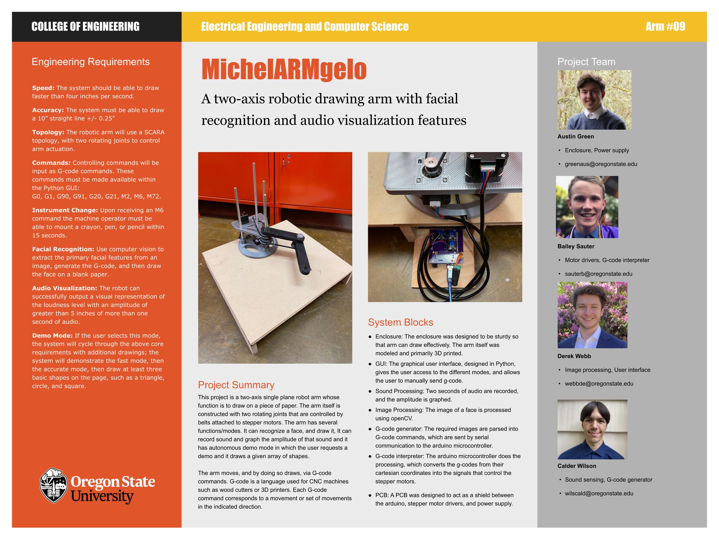 This project is a two-axis single plane robot arm whose function is to draw on a piece of paper. The arm itself is constructed with two rotating joints that are controlled by belts attached to stepper motors. The arm has several functions/modes. It can recognize a face, and draw it, It can record sound and graph the amplitude of that sound and it has autonomous demo mode in which the user requests a demo and it draws a given array of shapes.