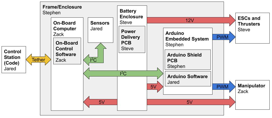 A neutrally buoyant underwater ROV (Remotely Operated Vehicle) designed with the goal of being able to un-plug a connector autonomously after being driven by a user to a work site. The ROV is powered by a custom designed on-board, rechargeable battery and uses five thrusters and a servo driven manipulator to accomplish its tasks. It is tethered to an on-shore computer and communicates with this computer using its Raspberry Pi on-board computer. The two computers send control messages using ROS (Robot Operating System). All of this makes the ROV a highly configurable platform for future research.