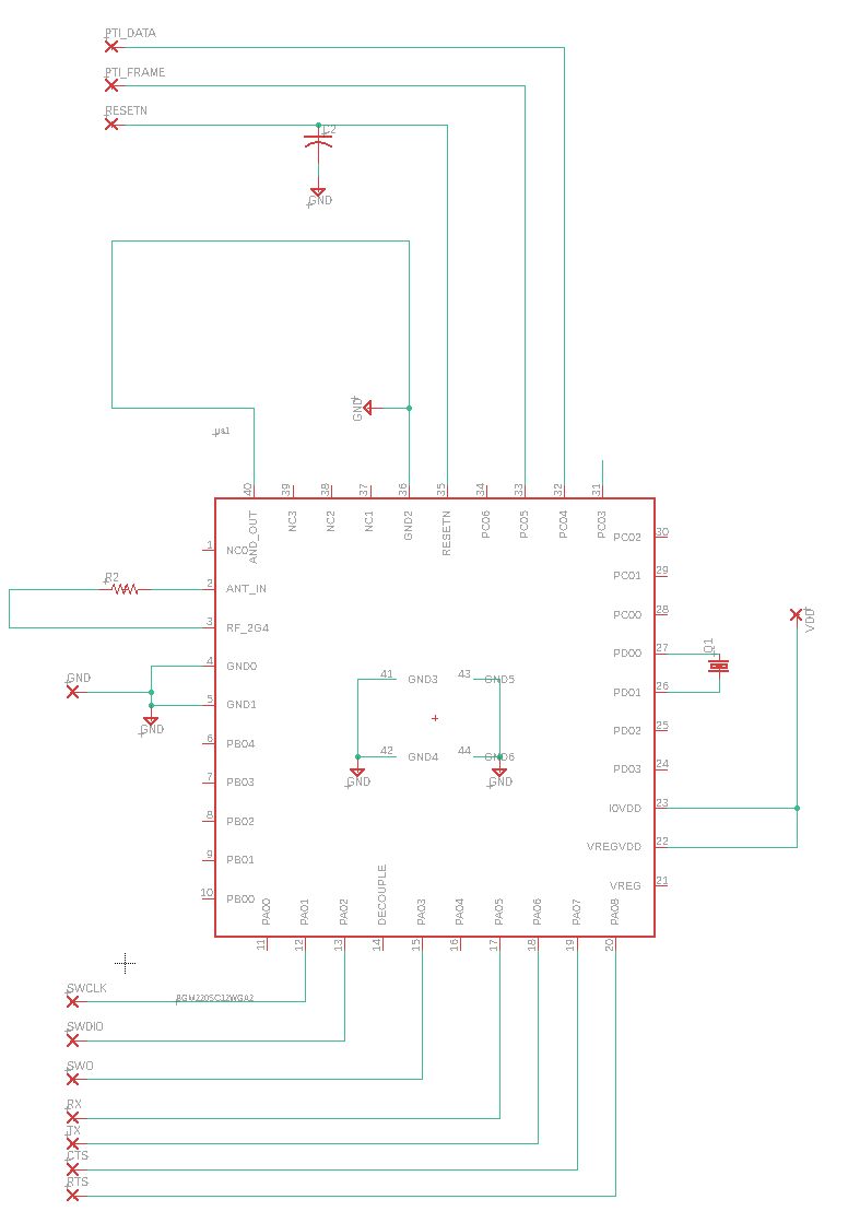 Pretty simple PCB meant for testing a chip based on the Silicon Labs BGM220S series of chips. In this case I was working with the BGM220SC12WGA2 for my senior design project. There are pads for allowing this chip to work as a standalone Bluetooth + Microcontroller and as just a Bluetooth module. There weren't very many difficulties in creating this PCB except for some small quirks with creating non-rectangular SMD pads for the footprint of the chip and sometimes assigning things to ground that are not connected to ground in the schematic.