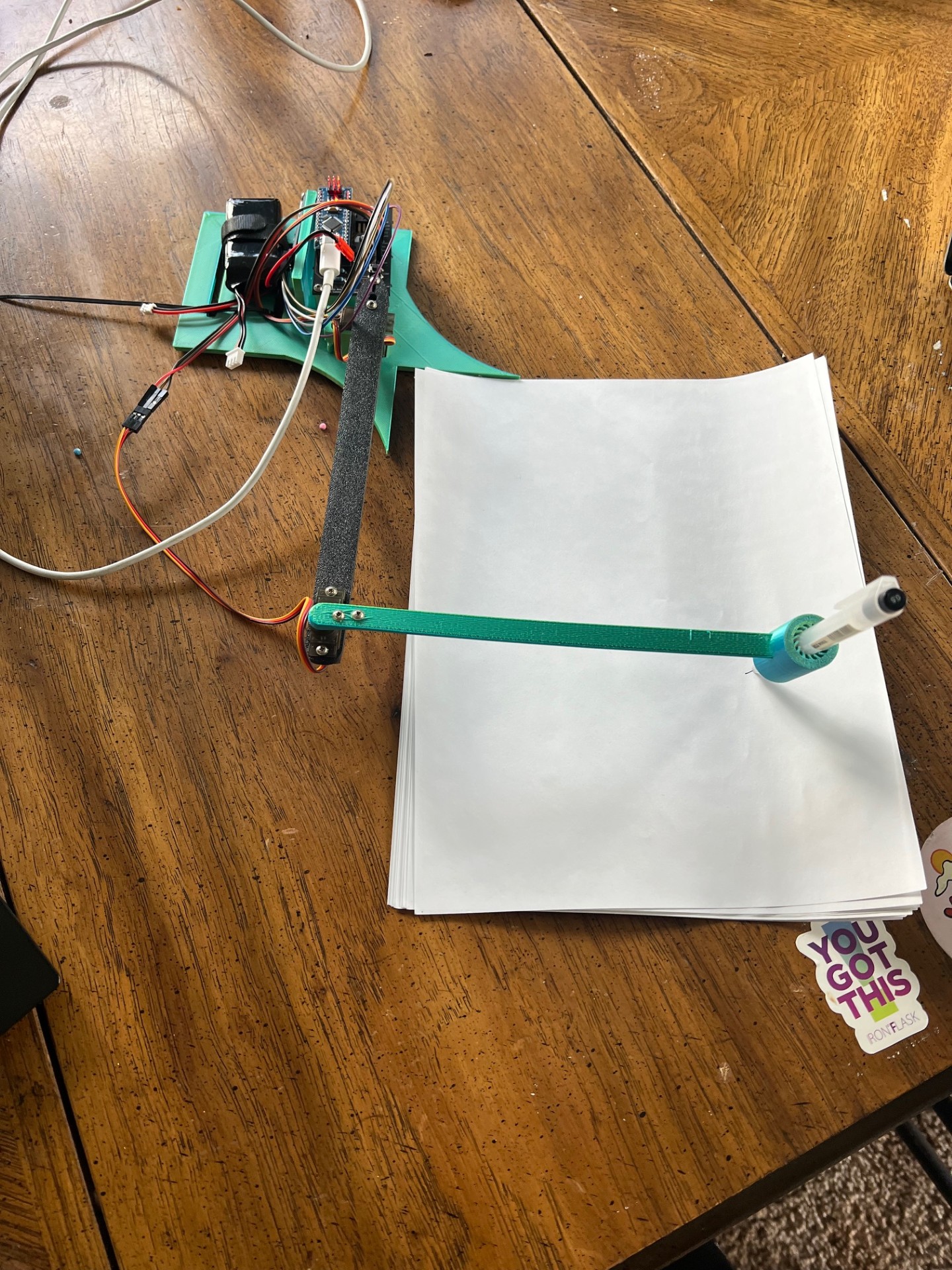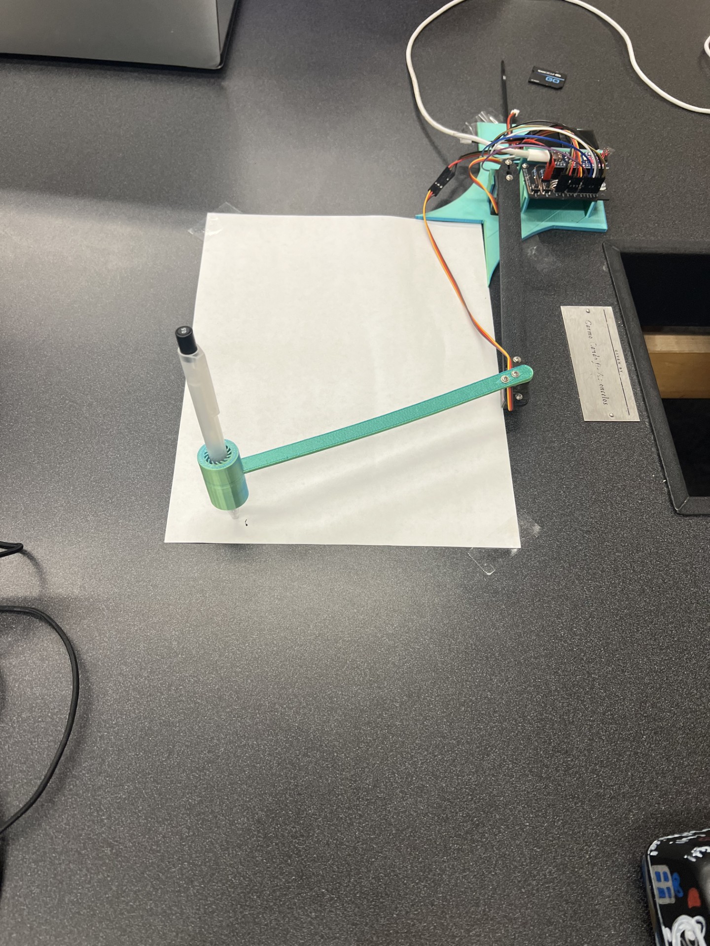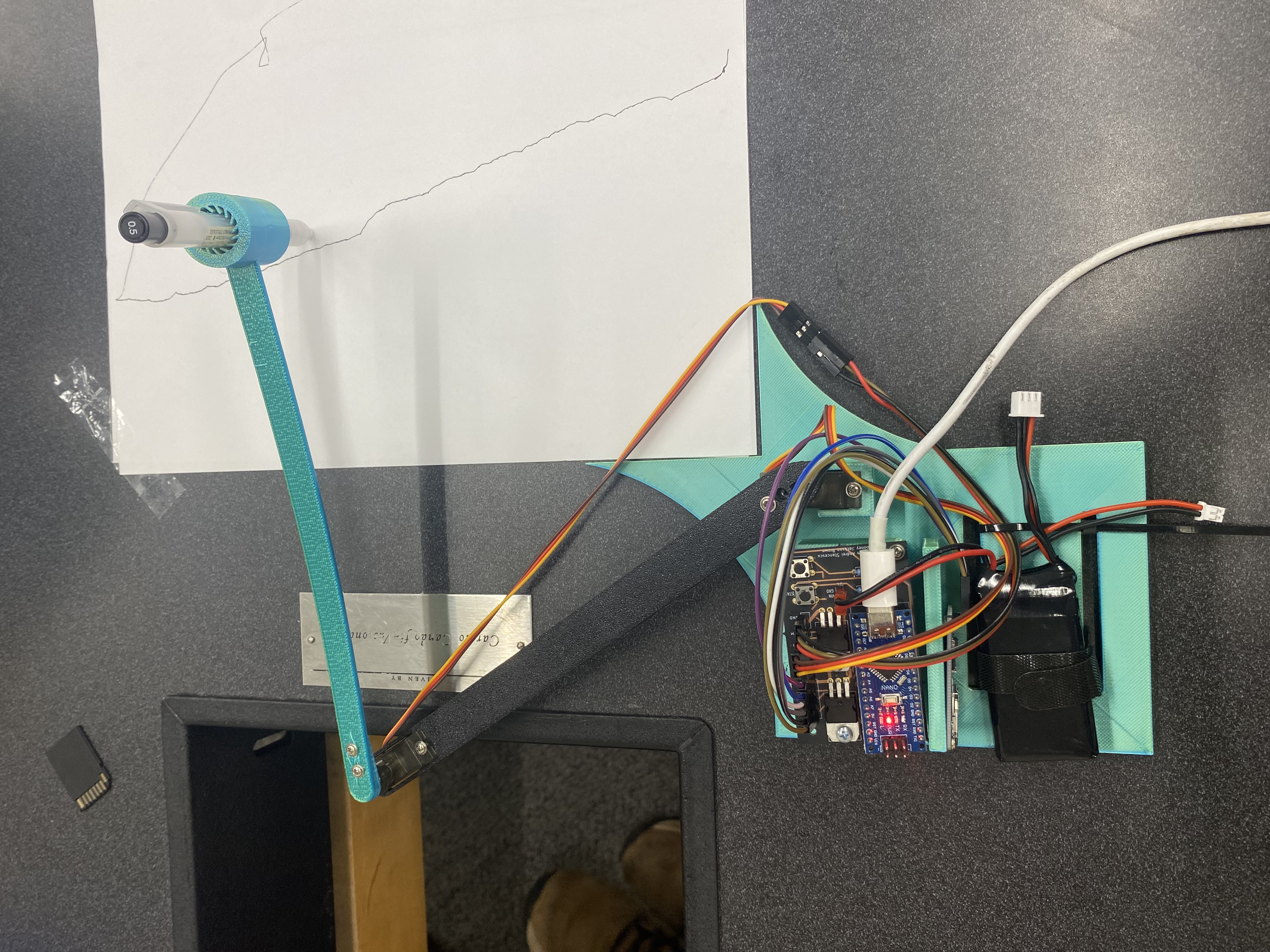 The intended use of our robotic system is for an arm to draw lines on a piece of paper coming from a Python GUI as user input. It also incorporates horizontal, vertical and diagonal lines. The SD-Card bot was built with 2 servo motors and an Arduino nano. It takes in three inputs mainly in terms of buttons; these include the start and pause buttons. The other user input is the sd card which takes a moves.txt file containing all the G-code commands from the graphic user interface. One accomplishment was the GUI interface which allowed the user to use a sketchpad to draw the robotic arm output. This was very intriguing as we were still able to pass G-code commands through. We also created a PCB to handle the dcpwr module which was impressive given our knowledge from JD1. A main challenge was getting the Arduino Nano to understand the parsed G-code in the .txt file. Sometimes, the robotic arm system wasn't able to draw a straight line or 4 inches per second due to issues with the .txt->parser->servos communication.