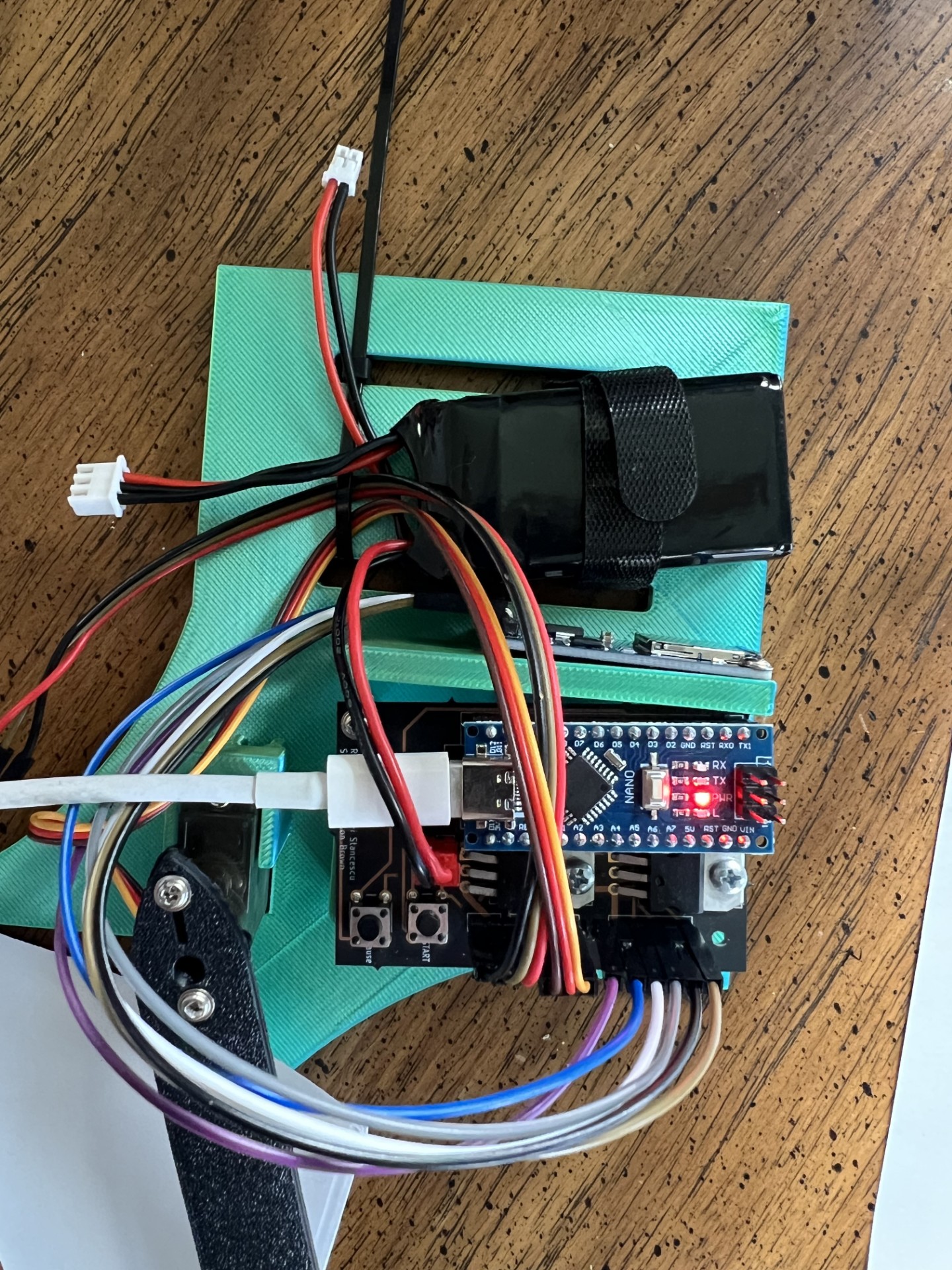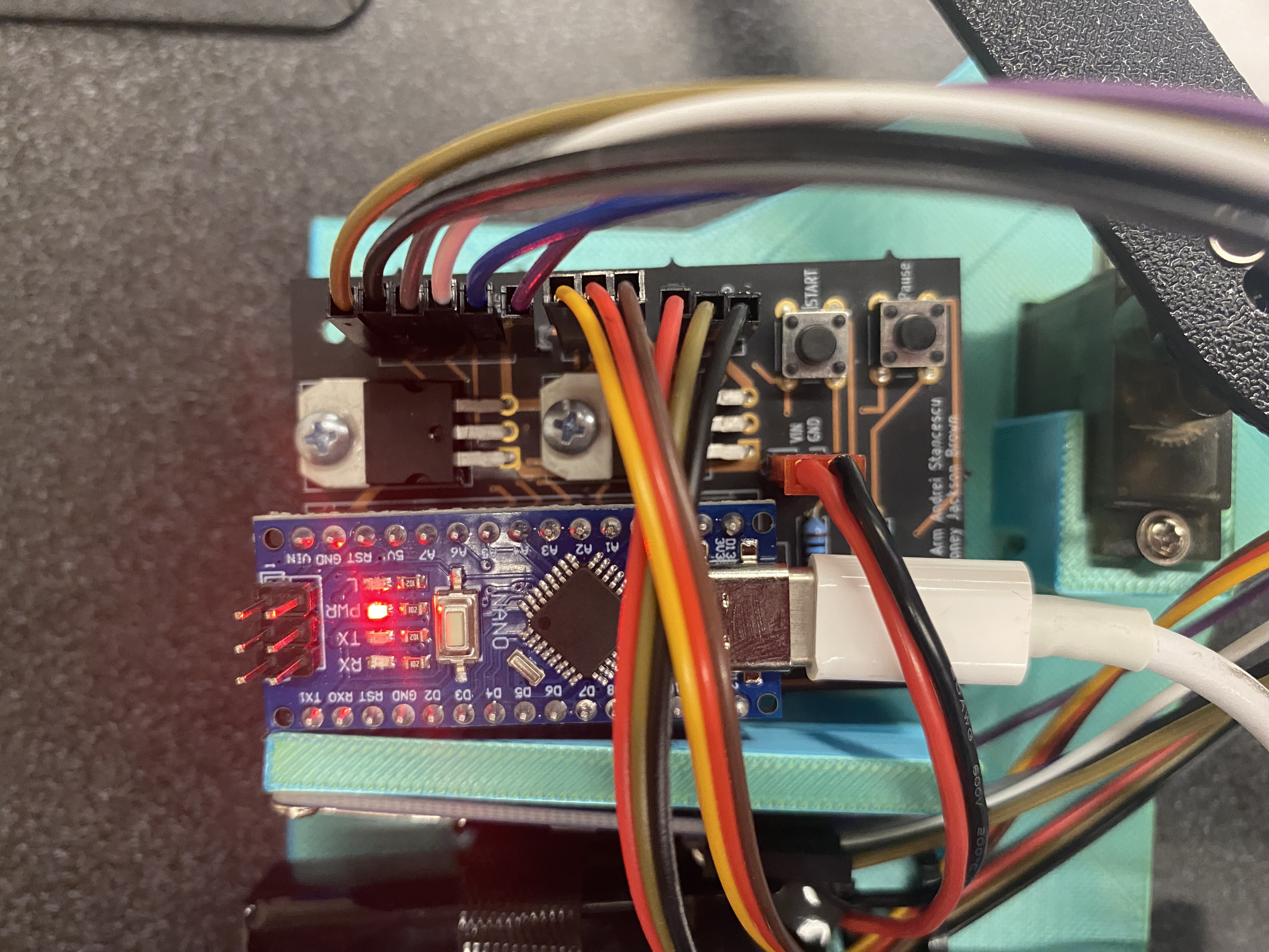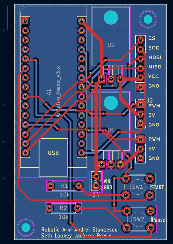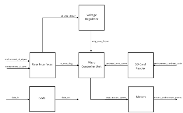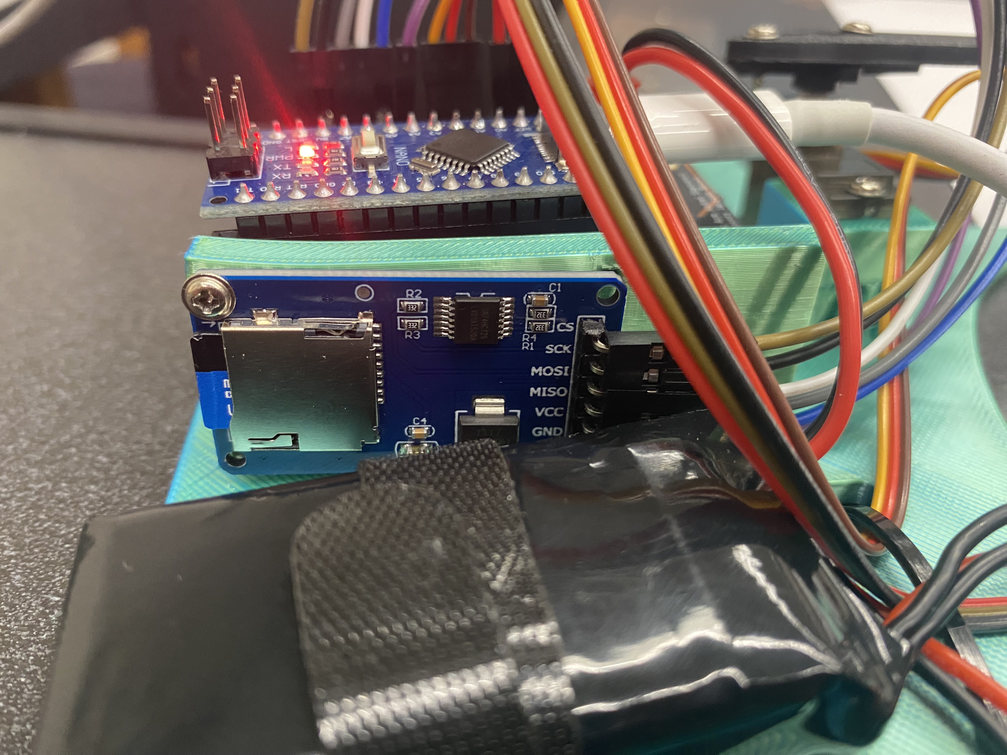 The intended use of our robotic system is for an arm to draw lines on a piece of paper coming from a Python GUI as user input. It also incorporates horizontal, vertical and diagonal lines. The SD-Card bot was built with 2 servo motors and an Arduino nano. It takes in three inputs mainly in terms of buttons; these include the start and pause buttons. The other user input is the sd card which takes a moves.txt file containing all the G-code commands from the graphic user interface. One accomplishment was the GUI interface which allowed the user to use a sketchpad to draw the robotic arm output. This was very intriguing as we were still able to pass G-code commands through. We also created a PCB to handle the dcpwr module which was impressive given our knowledge from JD1. A main challenge was getting the Arduino Nano to understand the parsed G-code in the .txt file. Sometimes, the robotic arm system wasn't able to draw a straight line or 4 inches per second due to issues with the .txt->parser->servos communication.