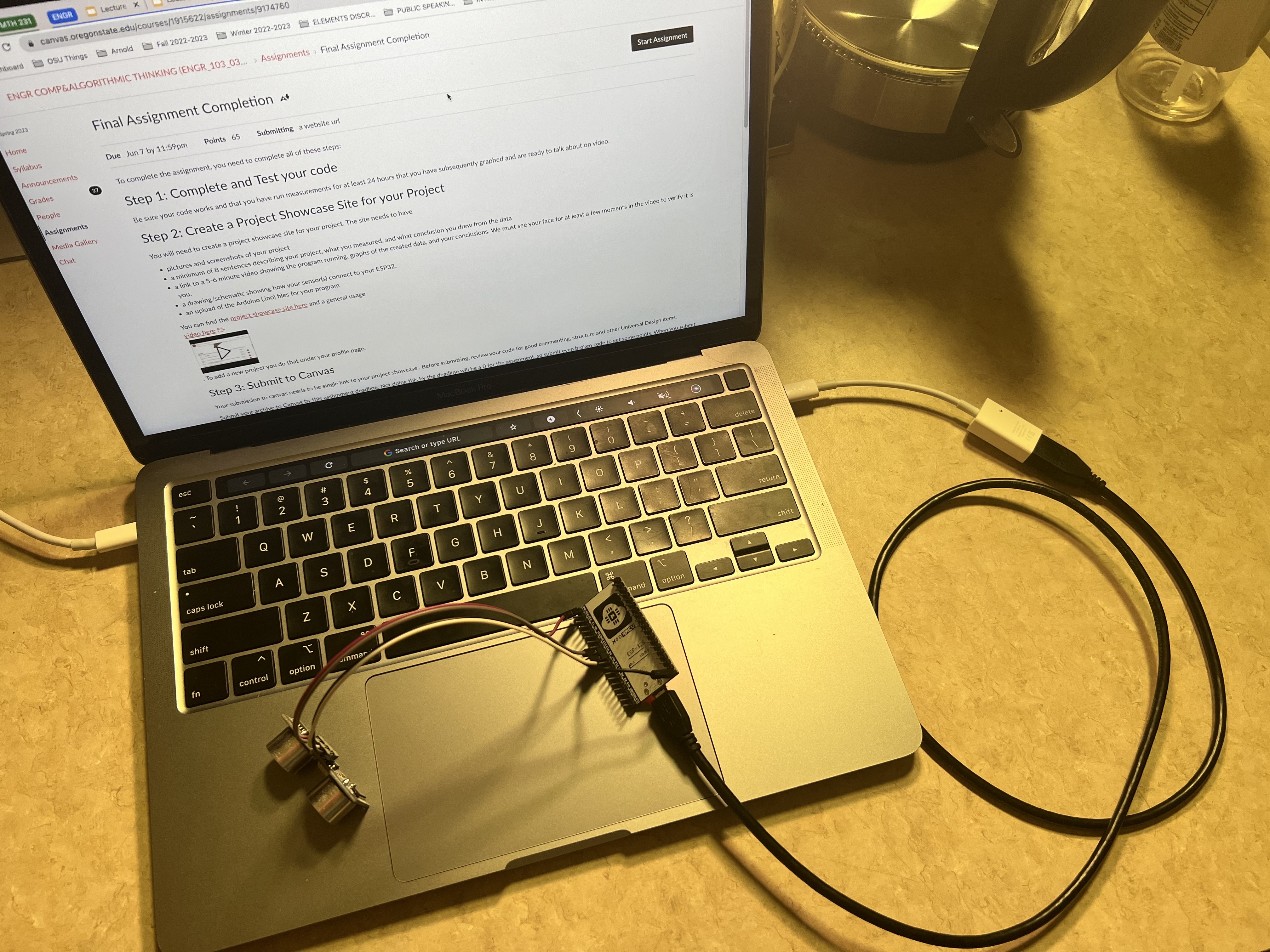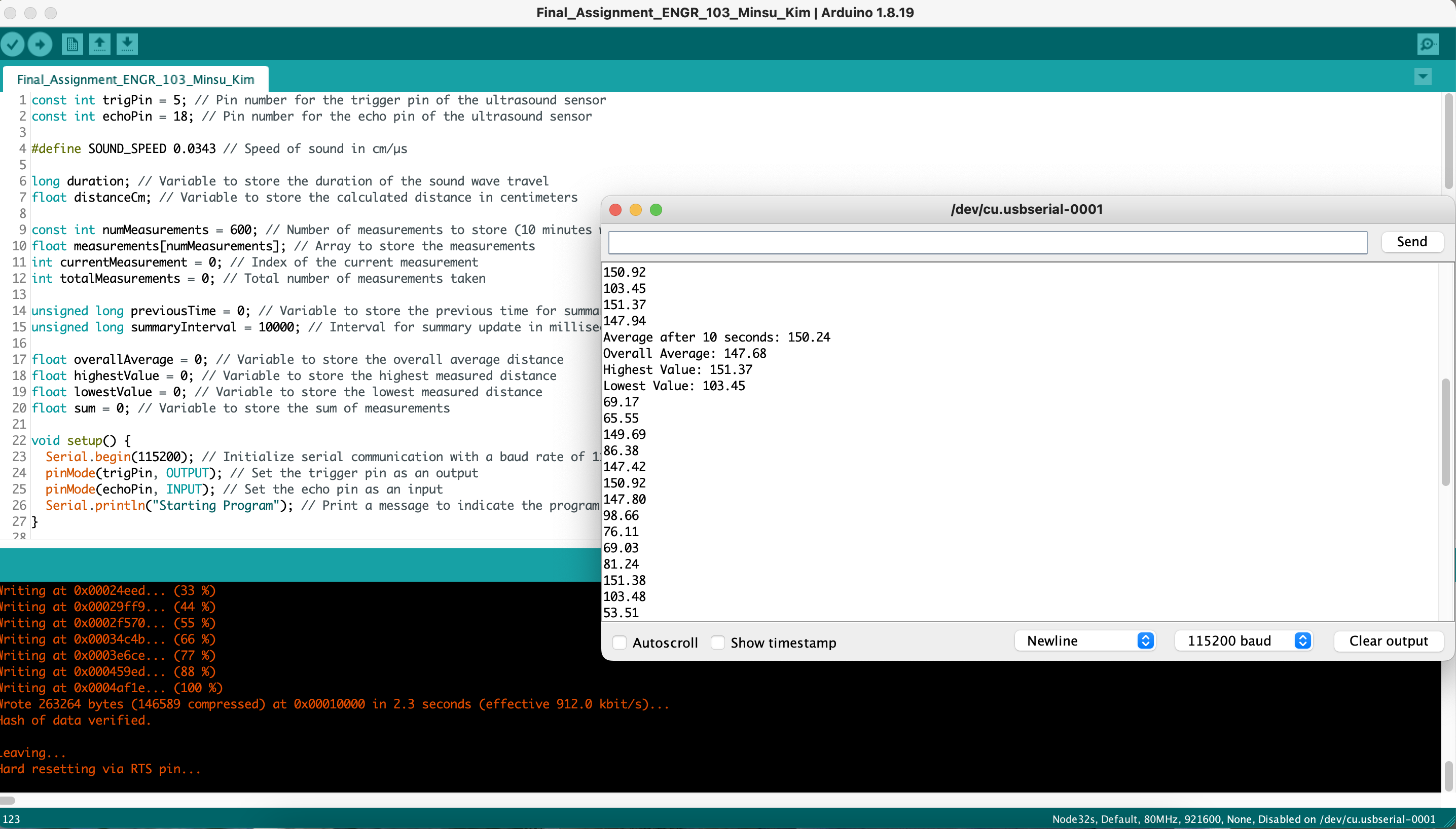 For the final project in the class, I was assigned with measuring data for a period of 24 hours. I choose to measure the distance (cm) from my desk to my door. Meaning this would allow me to track when my door had opened because any other value other than the actual distance from my desk to the door would mean that I had opened the door. This distance was measured through the ESP32 with a HC-SR04 Ultrasonic Sensor programmed within Arduino IDE. I also inserted my data collected from the serial monitor into a spreadsheet to create a graph of my data. Within this assignment I learned how to manage big data. I also learned that with big amounts of data requires a lot of preparation and additional time to collect the data. This assignment really tested my knowledge of all the skills I learned within the course of ENGR COMP&ALGORITHMIC THINKING.