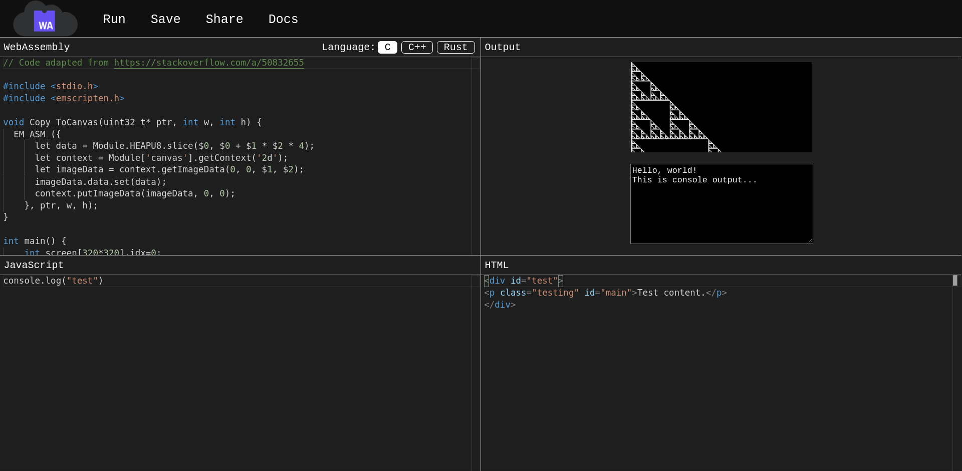 Compiling and executing web assembly modules can take up valuable time. This web app allows users to conveniently test their ideas with web assembly. Users can write code in the browser and then compile and run the code as a web assembly module. Although this isn't useful for developing a large scale web application, it can potentially speed up development by allowing users to test and optimize small portions of code. It makes sharing ideas easier as code can be shared and tested by anyone. WASM Fiddle allows users to compose C, C++ and Rust code in the browser and then compile and execute the code.