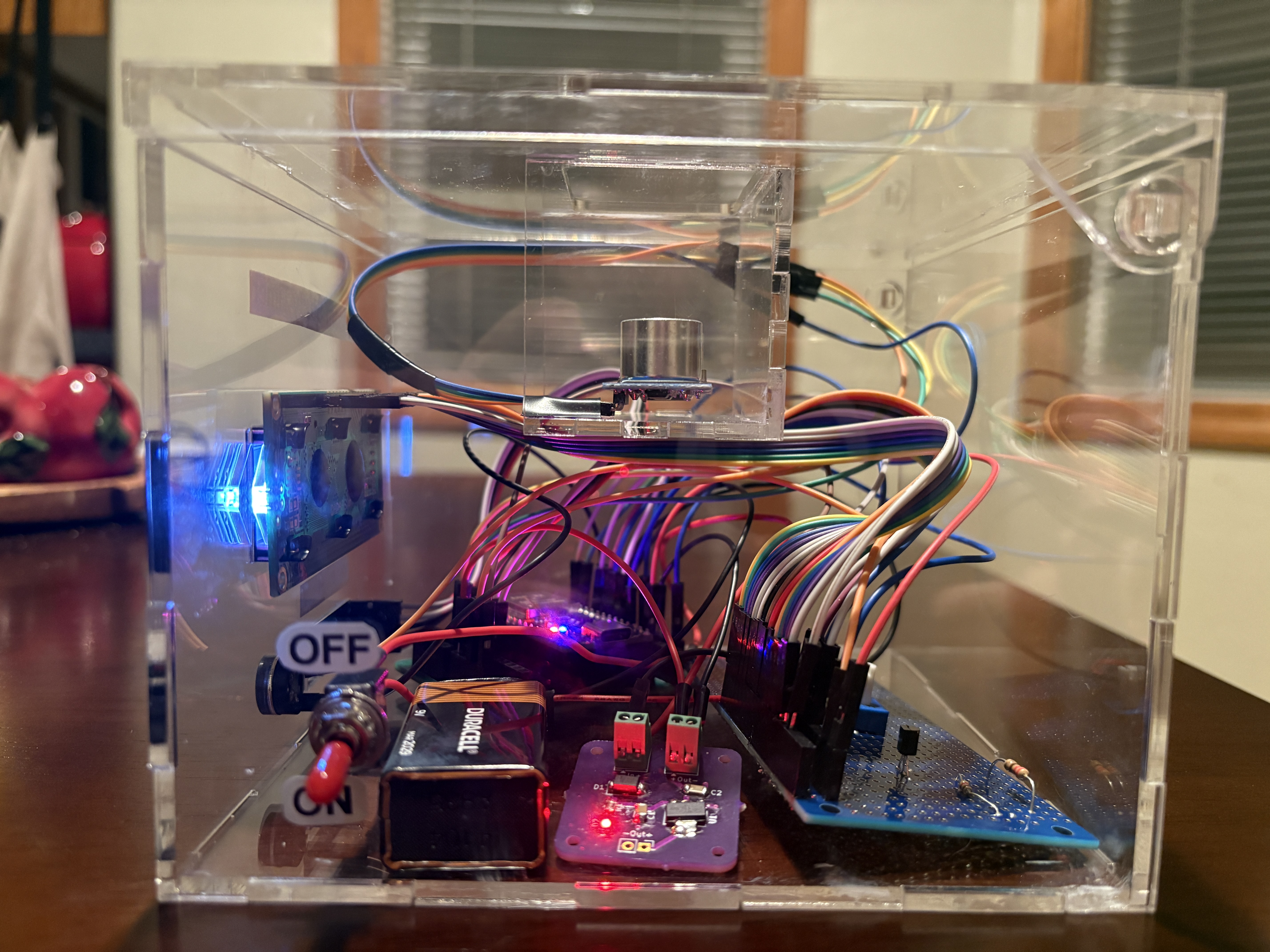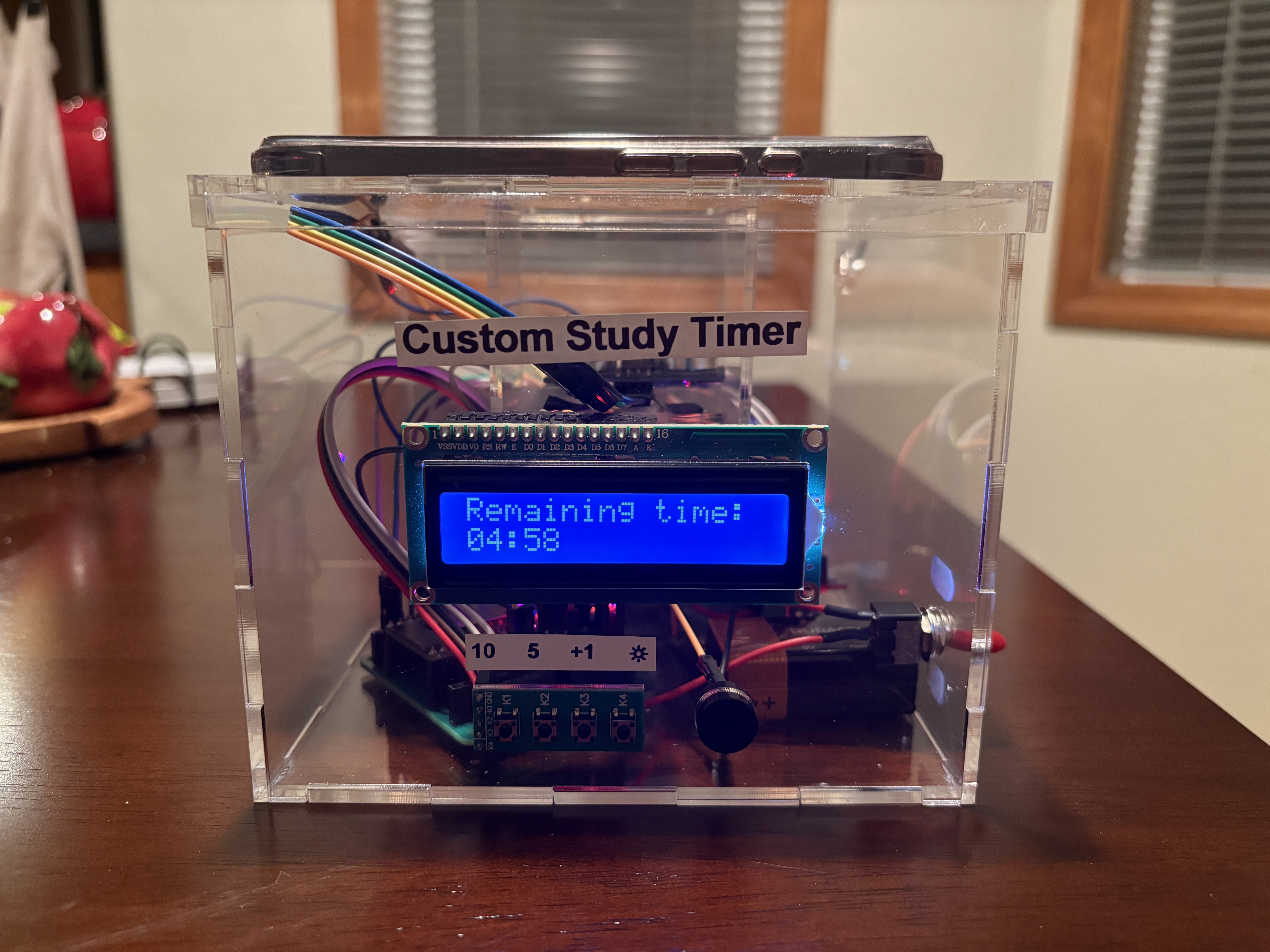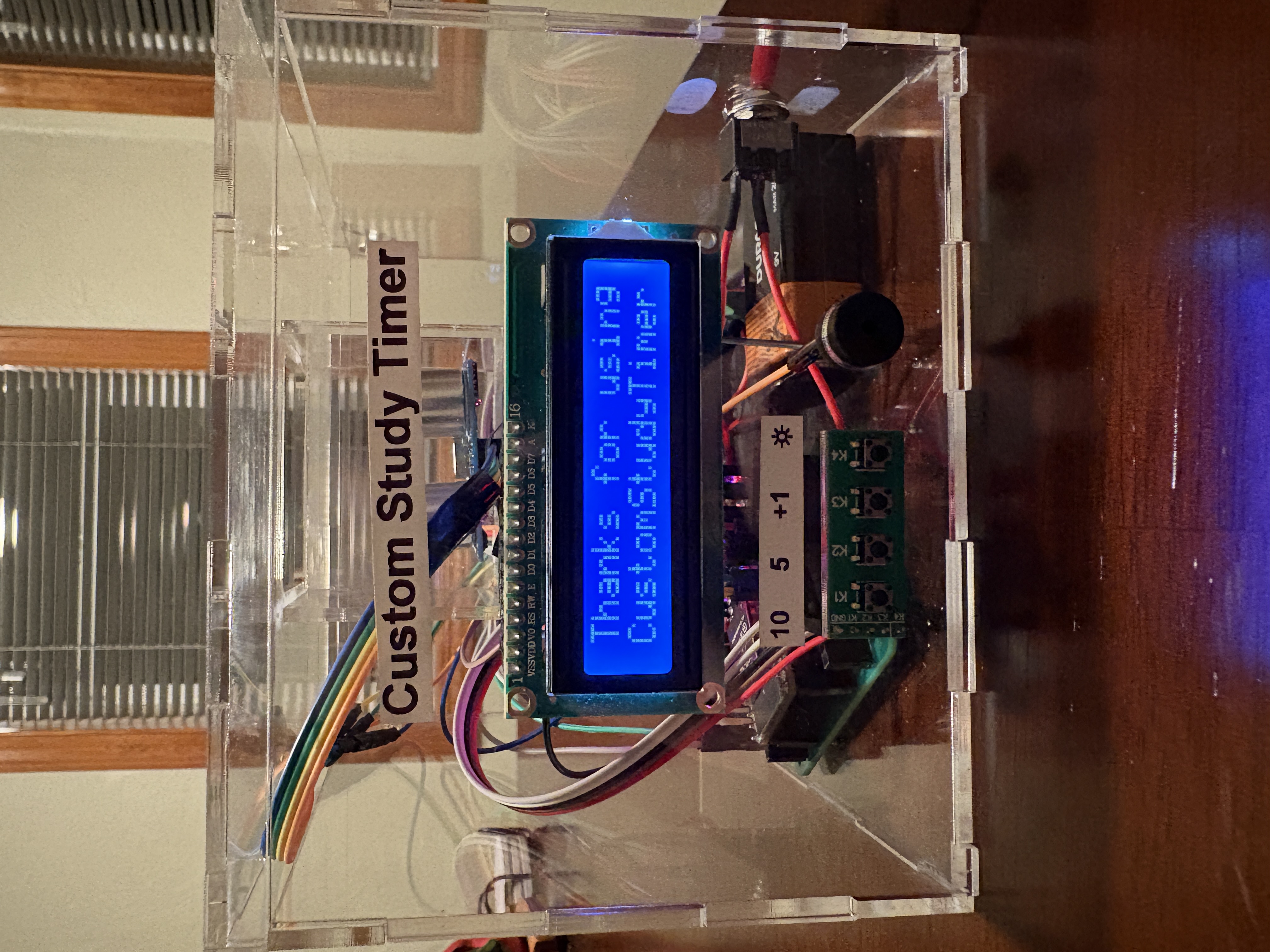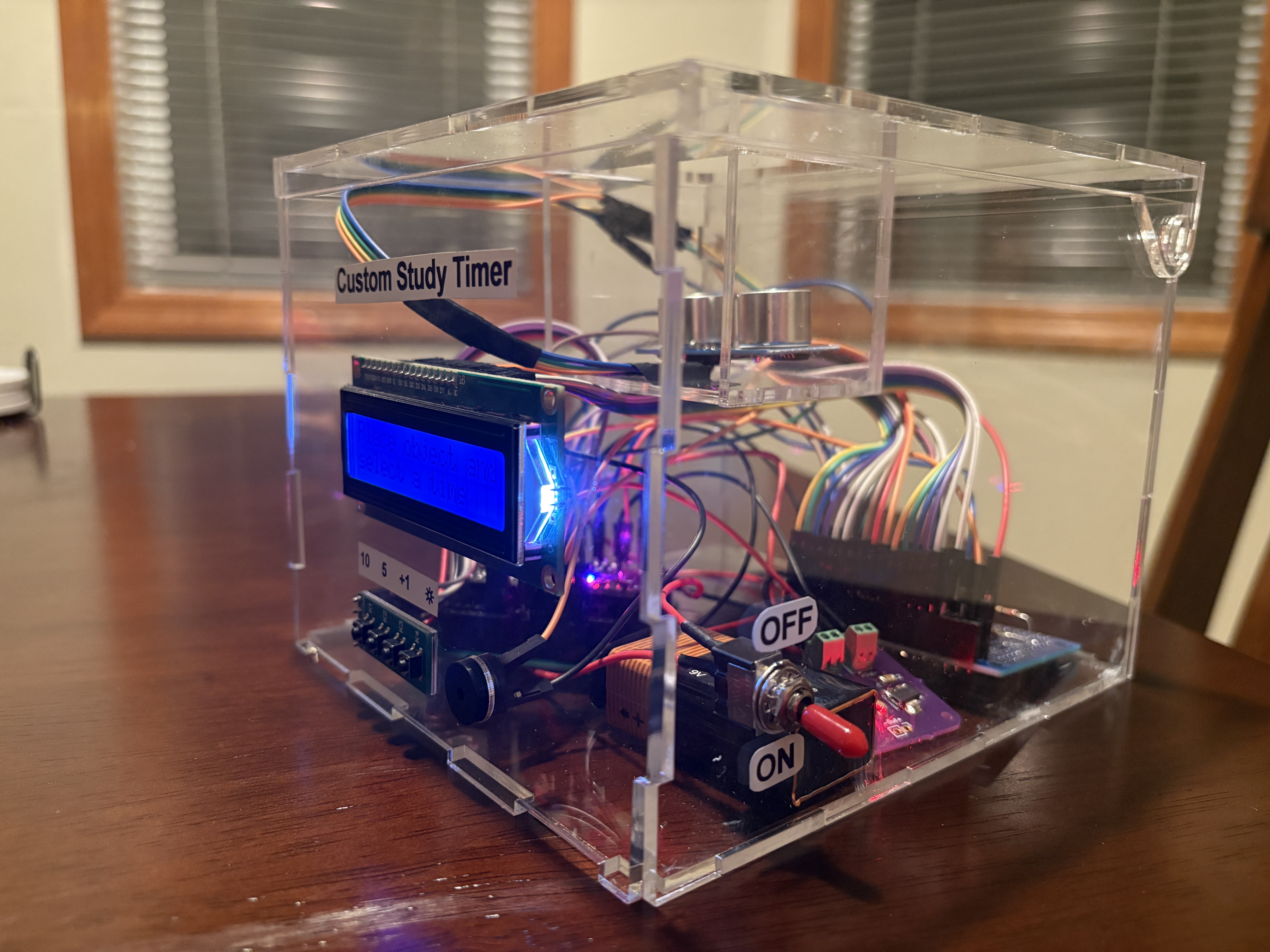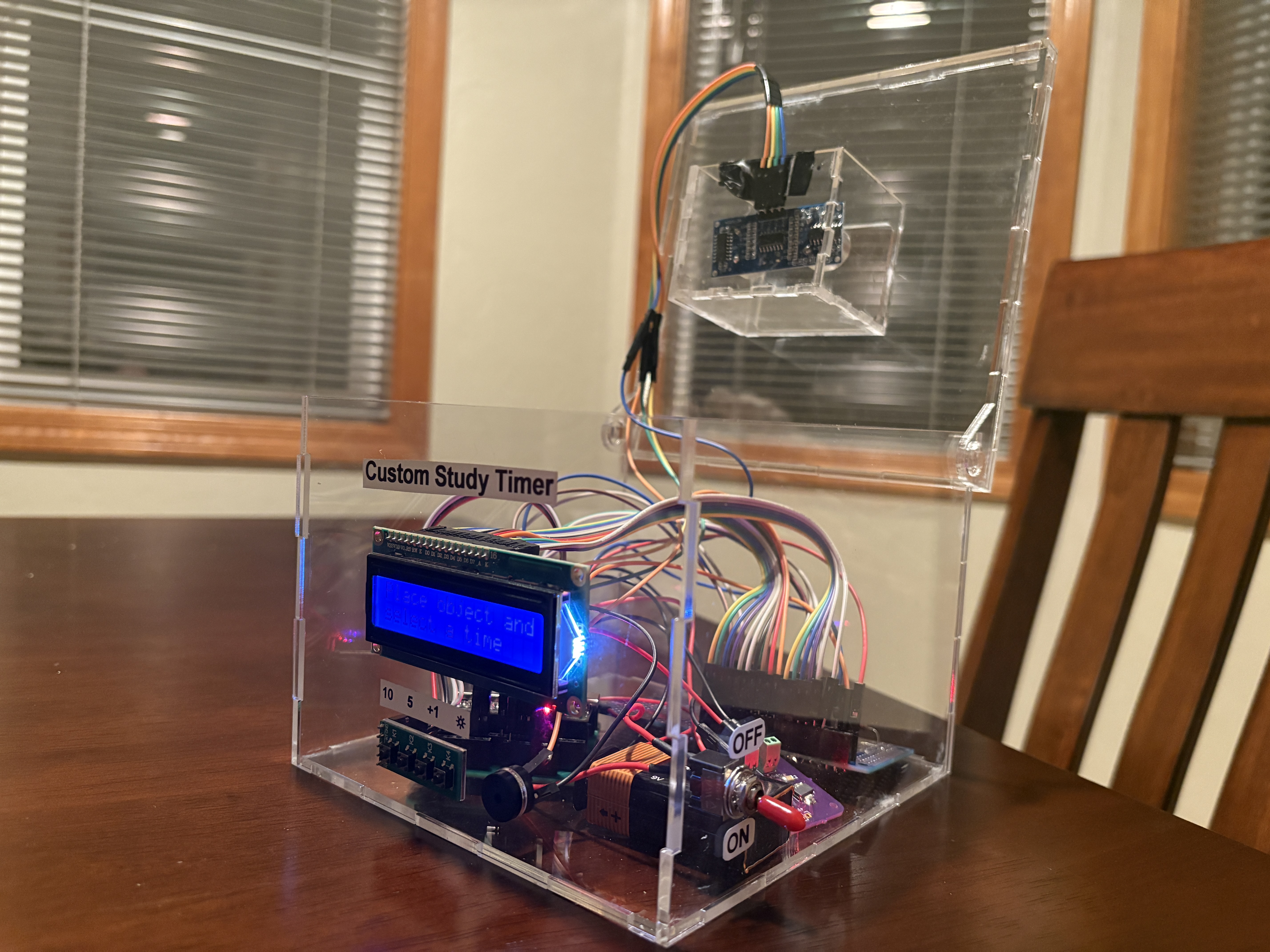 Have you ever had a large homework assignment or a big project due the very next day but you couldn’t help but scroll on your phone to procrastinate? This is where the Custom Study Timer comes in handy to fulfill all of your wishes of being genuinely proactive! The Custom Study Timer is meant to be used as a way to keep students focused on their schoolwork and to avoid distractions. The Custom Study Timer is created with all of the users’ needs in mind. To start the system, there is simply a switch on the side of the box which will power it via a battery. On startup, the system will prompt the user to place their phone on top of the timer where it will prompt the user for a 5 minute or a 10 minute timer. Once the desired option is selected, the countdown will begin. Should the user need more time studying, a button is available to increase the timer by 1 minute increments. Once the timer is up, a 440Hz buzzer will go off to alert the user. Features: Some of the main features that this Custom Study Timer has included are: time-adjustable buttons, 3 different display brightness levels, a buzzer to let the user know when the time is up, and a phone detection system. Time-Adjustable Buttons: On the system startup, the user has two options for how long they want the timer to run: 5 mins and 10 mins. Once the timer has begun counting down, the user has the option to increase the timer countdown by 1 minute through a button should the user want to study for a longer period of time. 3 Different Display Brightness Levels: All students have different study preferences: some may prefer to study in darkness while others may prefer to study in bright light. Regardless of the students’ preference, there are 3 different brightness levels that they can choose by the press of a button to suit their needs. Time Up Buzzer: Once the timer has finished, there is a loud buzzer that will go off at 440Hz to let the user know that time is up and they can take a well-needed break! However, in order to help the user resist the urge of just picking up their phone during their study time, if the phone has been detected to be removed from the system, the buzzer will also go off. Phone Detection System: The overall system is capable of detecting any phone that is placed on top of the box by way of an ultrasonic sensor. When the phone is placed on the box, the system will detect it and begin the timer countdown. If the system detects that the phone was removed from the box before the timer has ended, the buzzer will be set off accordingly. Enclosure: The Custom Study Timer is made out of 3mm clear acrylic walls, allowing users to view the insides of the device. For ease of use, the enclosure is neatly labeled for the buttons, and the emergency switch on the side. For any minor adjustments or curiosity, lift the enclosure’s lid to access the electrical components. Custom PCB: Inside of the enclosure is a custom PCB that acts as a breakout board. A breakout board contains a microcontroller in the center, while maintaining accessibility to the pins on the microcontroller. The purpose of a breakout board is to “break out” the leads of a component on separate terminals so that manual connections can be made easily.