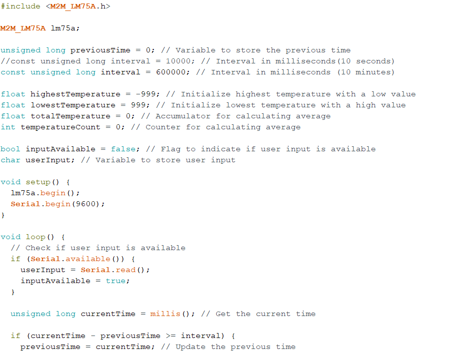 This project will use an ESP32 board and an LM75A temperature sensor to measure room temperature. This project will include an M2M_LM75A library created by M2M Solutions AB. Some things to keep in mind for this project: The temperature will be measured in degrees Celsius. User inputs will be included to allow the user to view the highest temp. value, lowest, temp. value, and the overall average of temperatures recorded in the serial port. The sensor will display 10-minute averages and the time interval will be measured in milliseconds. For this specific project, I will be measuring the temperature within my dorm room. My purpose here is to see how hot or cold my room gets between day and night. My expectation is that my room is much colder at night since there isn't much sun out at night and such. Some things to keep in mind: The heater has been disabled for the rest of the summer. The window will stay closed no matter what. Based on my recording and data, it would appear that my room temperature seems to increase at night rather than decrease. Hence, my room is colder during the day and hotter during the night.