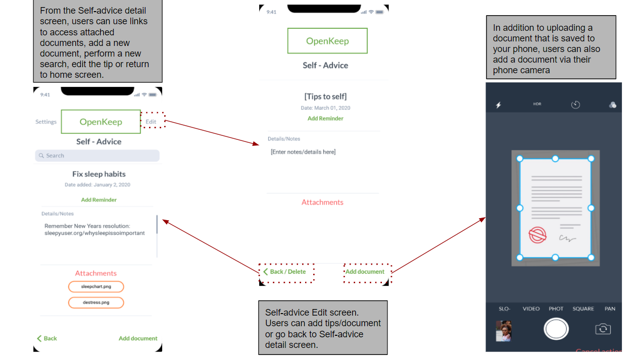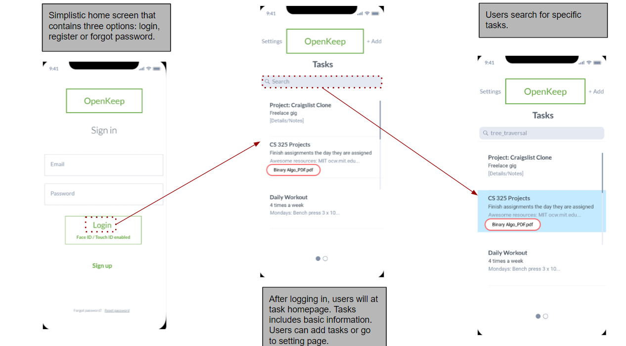 Task management is hardly, if ever, a fun and exciting process. Part of the difficulty of staying motivated towards your goals is the constant stress of failure due to unrealistic deadlines or unnecessary time restraints. Our project aims to help end the stress of task management with a new type of app that motivates users based on achievements and provides a space dedicated to note taking and task tracking. Some of the key features of this app will be: Haptic Feedback Note Taking Capabilities User Score Push / Pop Effects These features, while not entirely original in themselves, are well-documented and are currently in use in other types of applications. Existing examples can help to inspire our design and make implementation an easily achievable goal. OpenKeep is an application used for tracking the tasks of an individual. This application seeks to provide tools and motivation to users as they progress towards task completion. Unlike the wide variety of currently available organizational apps, OpenKeep is built around the idea that individuals can be encouraged to work on their tasks without the need for strict, time-based deadlines. Since this app is designed to increase productivity and motivation, an additional feature to this app is a self-advice interface. No more bookmarking websites and keeping forgotten productivity advice from blogs or websites. OpenKeep’s self-advice interface allows the user to consolidate all useful productivity information collected from websites/blogs and reminds them at set times. This paper provides the results of our empirical and analytical evaluations of our revised user interface prototype. The goal of these evaluations is to optimize user experience in OpenKeep.