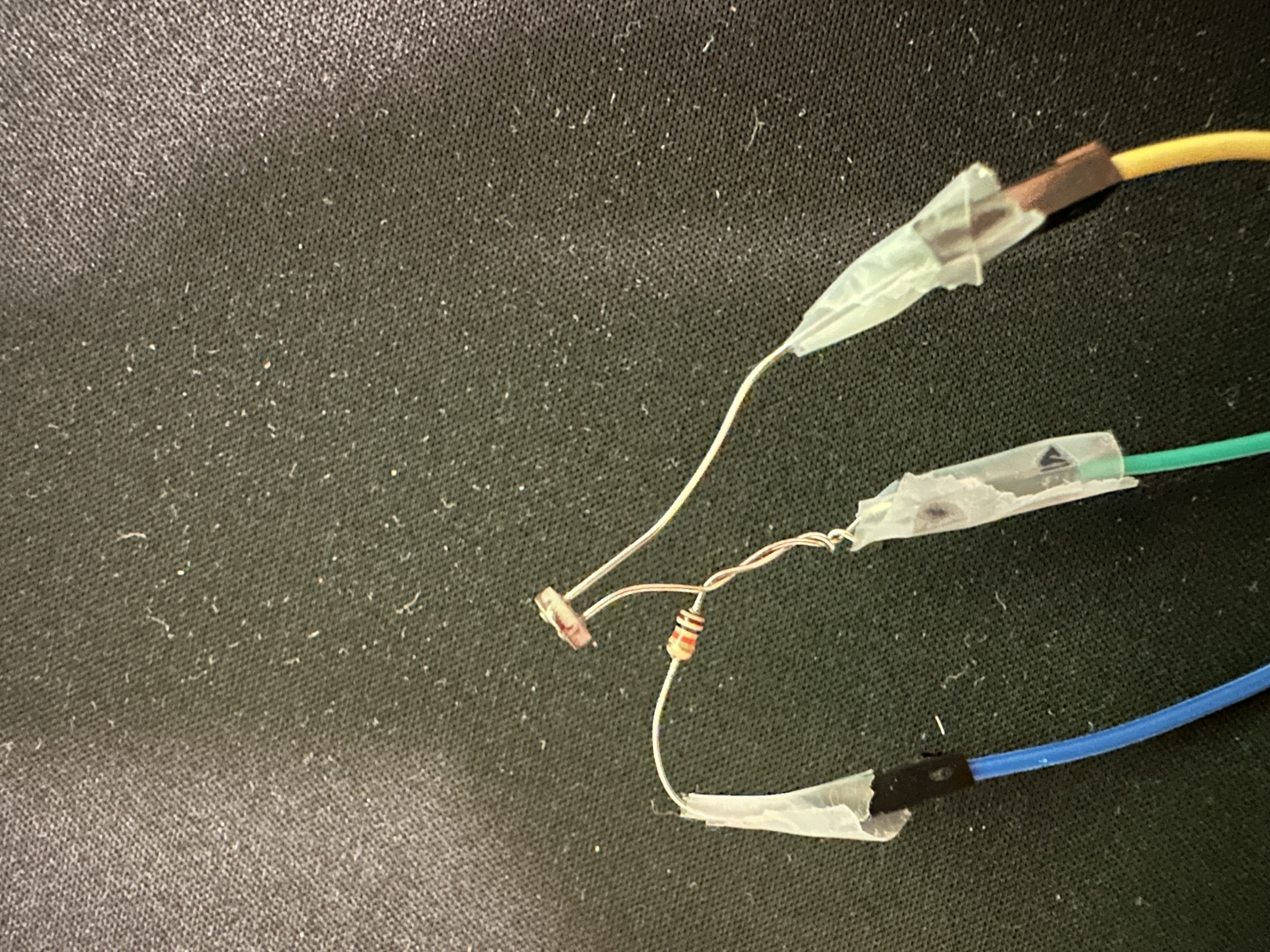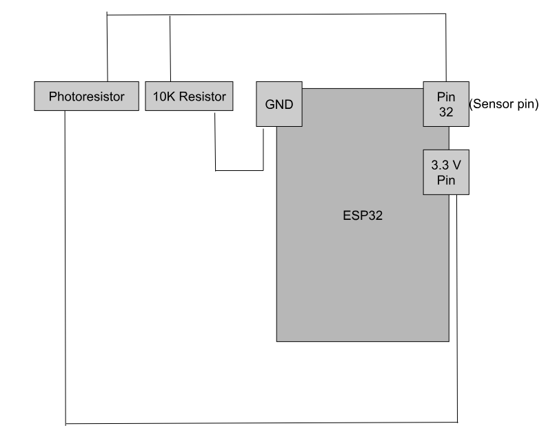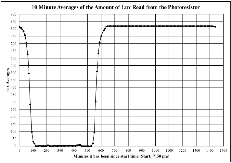 The chosen data logger is based on sensing light using a photoresistor. The photoresistor has a resistance that changes with the intensity of light hitting it. Using an ESP32, we can measure the resistance and write some lines of code in Arduino to display a value ranging from 0-4095, but using a conversion factor, we can turn this value into units of lux. I measured the incoming light outside from a window and let the sensor and code run for just over 24 hours. The materials used in the project were an ESP32, wires, tape, a photoresistor, and a 10K resistor. The photoresistor and the 10k resistor both have two wires and I twisted one of each together so I could connect power, the sensor pin, and ground to the ESP32. The wires were then held in by tape so that they wouldn’t be able to fall at any point during data logging. The code I wrote basically takes a reading from the sensor every second and after 600 readings, or 10 minutes, it will print out the average lux and reset everything back to 0 so that it can start on the next 10 minute interval.
