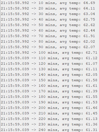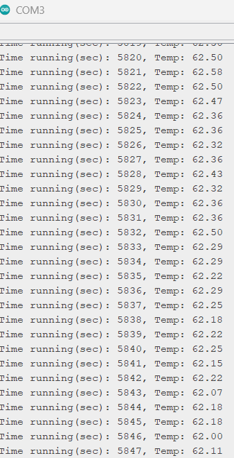For this project, we were tasked with developing a program that can monitor some conditions over the course of 24 hours. I chose to monitor the temperature of my dorm room over a 24 hour period. While the time I recorded (6/3-6/4) wasn’t a particularly hot spell, I thought seeing how the temperature of my room varied throughout a day would be interesting and topical; I, like many other students, am not much of a fan of how much we have to pay for dorms, and that we still don’t get A/C despite that. The data I collected showed exactly what was expected; as the day progressed, the room heated up. As night approached, temperatures began to cool down. Interestingly enough, the temperature of my room was slightly staggered from the temperatures outside; my room reached peak temperatures around 8pm, long after it had begun to cool off outside. Another interesting thing I noticed is that the readings were sensitive to body heat. When I sat down at my desk, the temperature readings would slowly rise until it was about a degree or so in Fahrenheit higher than it was before. Overall, the data observed showed exactly what I expected; temperatures valued greatly, with a low of 56 and a high of 69 degrees, and averaged around 62. Attached in photos is my Arduino board as well as my thermistor and resistor setup, and a couple examples of some of the running code and some of the finished averages.