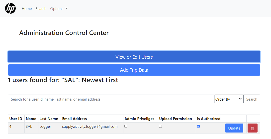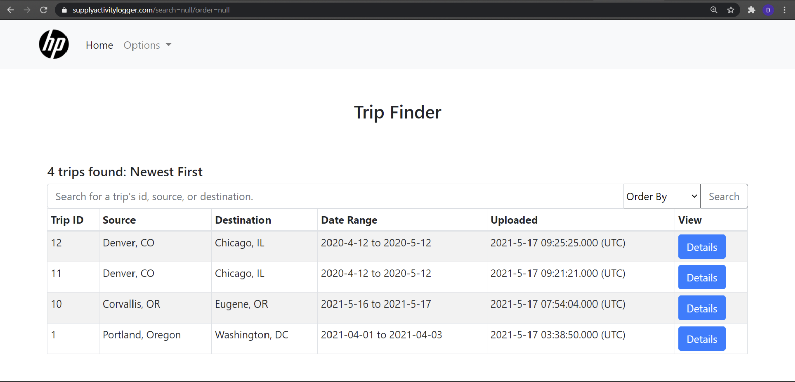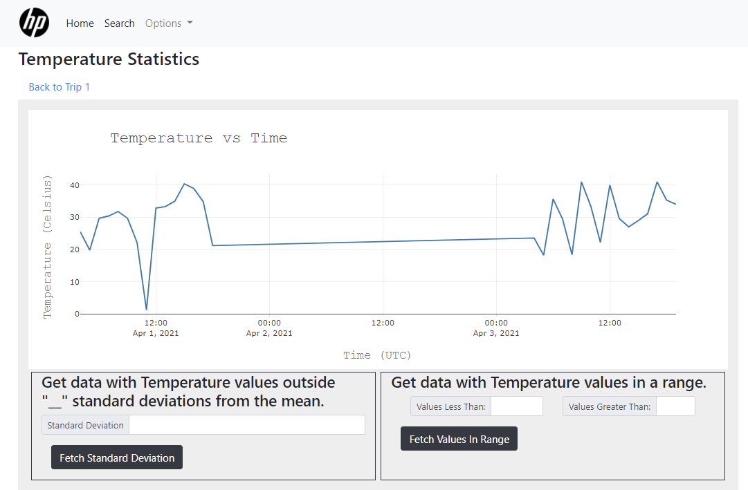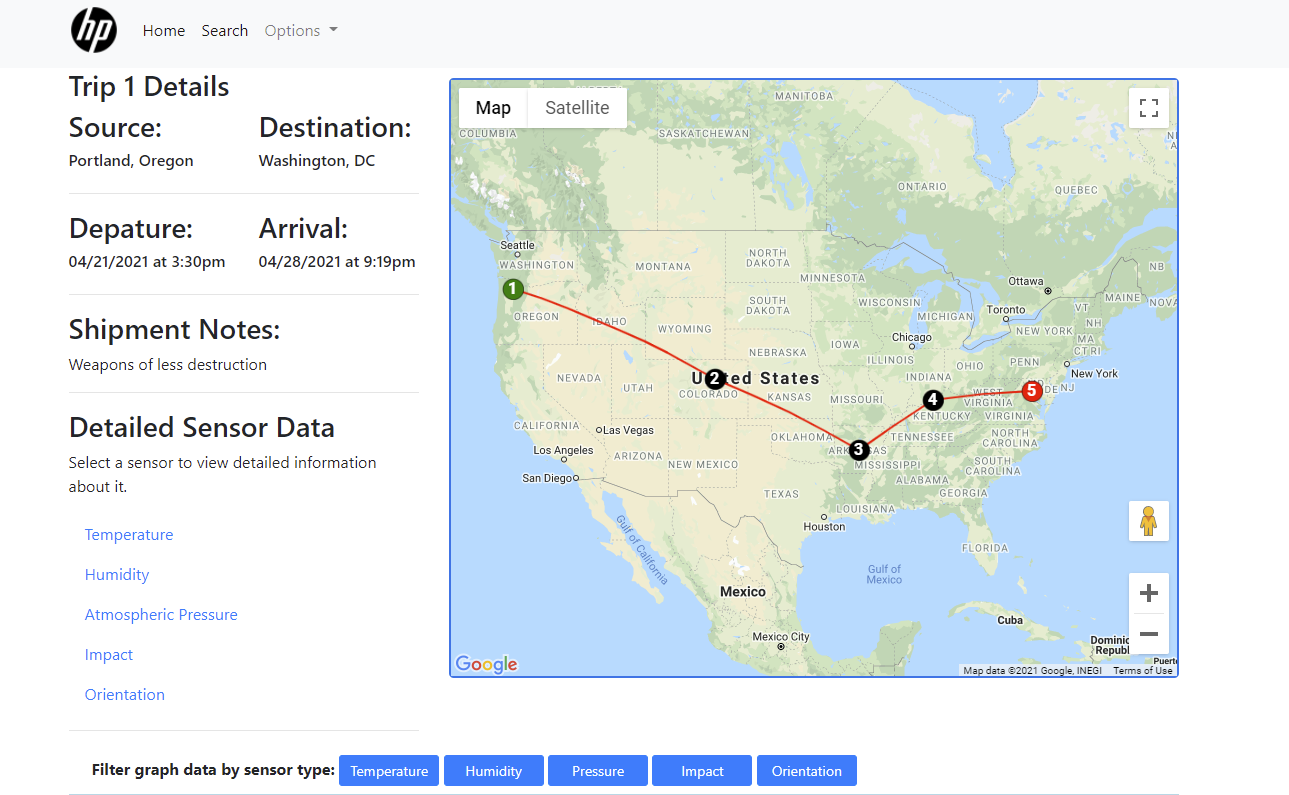 Every day, HP ships large volumes of products that range from commercial printers to personal computers. Occasionally, their products become damaged or unusable in transit. Ultimately, this costs the company valuable resources and impacts their relationship with clients and customers. It is not cost effective for HP to replace goods damaged during shipping. Building, packaging, and shipping replacement products wastes precious materials and contributes to the world’s growing carbon footprint. The Supply Activity Logger (SAL) device was developed to pinpoint where packages are being damaged, allowing HP to make logistical shipping changes and reduce excessive product waste in the future. The SAL project is comprised of two teams. Our partner team developed a small hardware device to be shipped with packages and log the conditions the shipment experiences in transit. The device includes sensors for temperature, humidity, atmospheric pressure, impact, orientation, and GPS location. The logged data is stored on an SD card and, at thee end of a trip, uploaded to a web application for data visualization. Our team developed a database and web application to graphically display the sensor readings from the SAL device and allow users to statistically analyze the data. The web application was developed using Node.js. We developed a MySQL database to store and statistically analyze sensor data. On the web application, we provide identifying information about the trip, and Google Maps to show GPS location readings for the trip. We used the Plotly library to display interactive graphs of sensor readings. To ensure the security of the data, we utilized Google authentication and only allow authorized user to utilize the web application. Authorized users may view details on each "trip" that the device has made. Users also have the option of analyzing the data based on user-defined standard deviations. The main accomplishment of this project is providing a visual tool for authenticated users to evaluate the locations where, and causes of, product damages. Although we had to adapt our work around the loss of a team member, we were able to develop what we believe is a solid and useful web application. For future improvements, we would consider optimizing how we process multiple queries for a single HTML request, and improving the data visualization technique for orientation data.