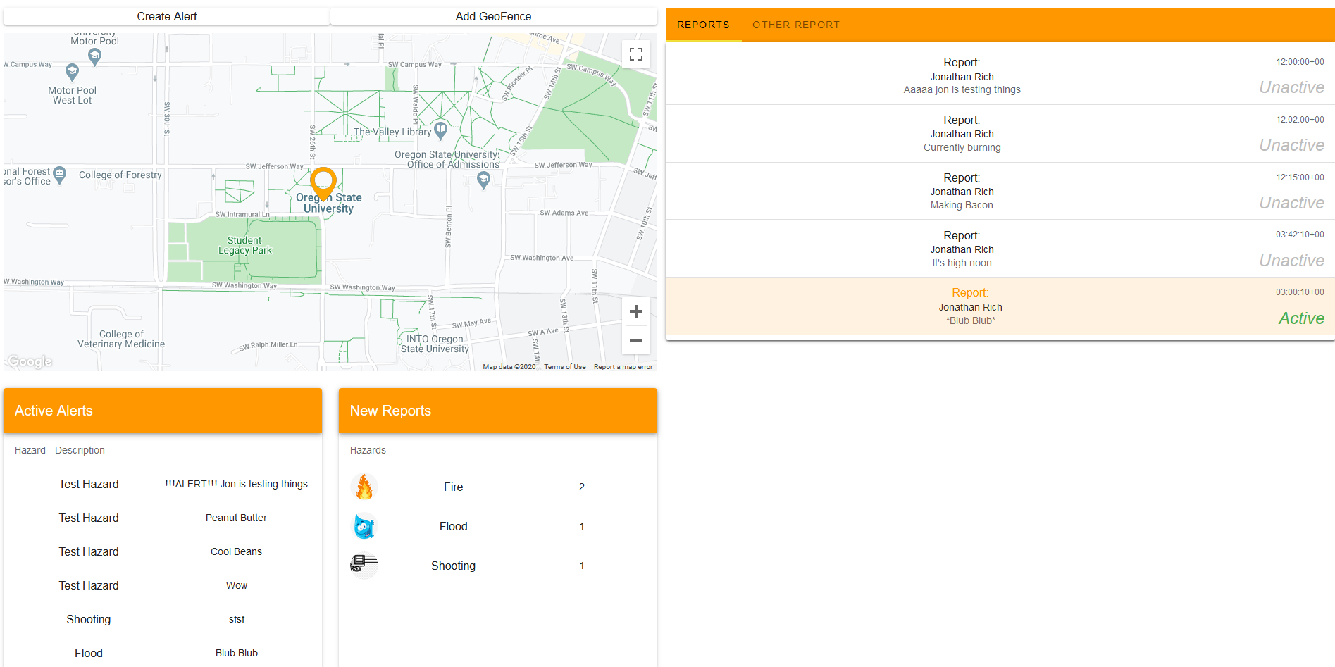 HazAdapt is a cutting edge product that is meant to revolutionize our current hazard response systems here at OSU. Currently there is no good way for the Emergency Manager, the person in charge of responding to potential threats such as fires or shooting reports, to respond and organize reports from users and to contact and inform emergency responders of that information. Our project focuses on the web application that this Emergency manager will use and will provide a streamlined interface that allows him to be notified and see on a map when and where reports have been submitted as well as sort the reports. He can also draw geofences and send alerts to specified users warning them of the hazard once it’s been verified. Our project consists of a front end interface created using Vue, Vuetify, and Vuex for state management where it connects to a Hasura instance on the back end that hosts our Apollo GraphQL database and the service is hosted on a Digital Ocean droplet.