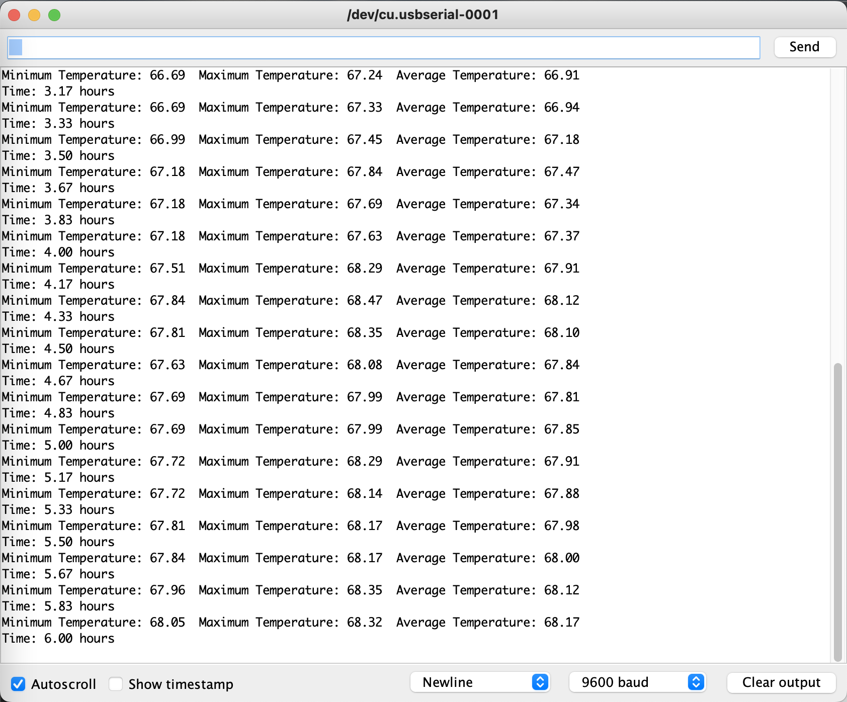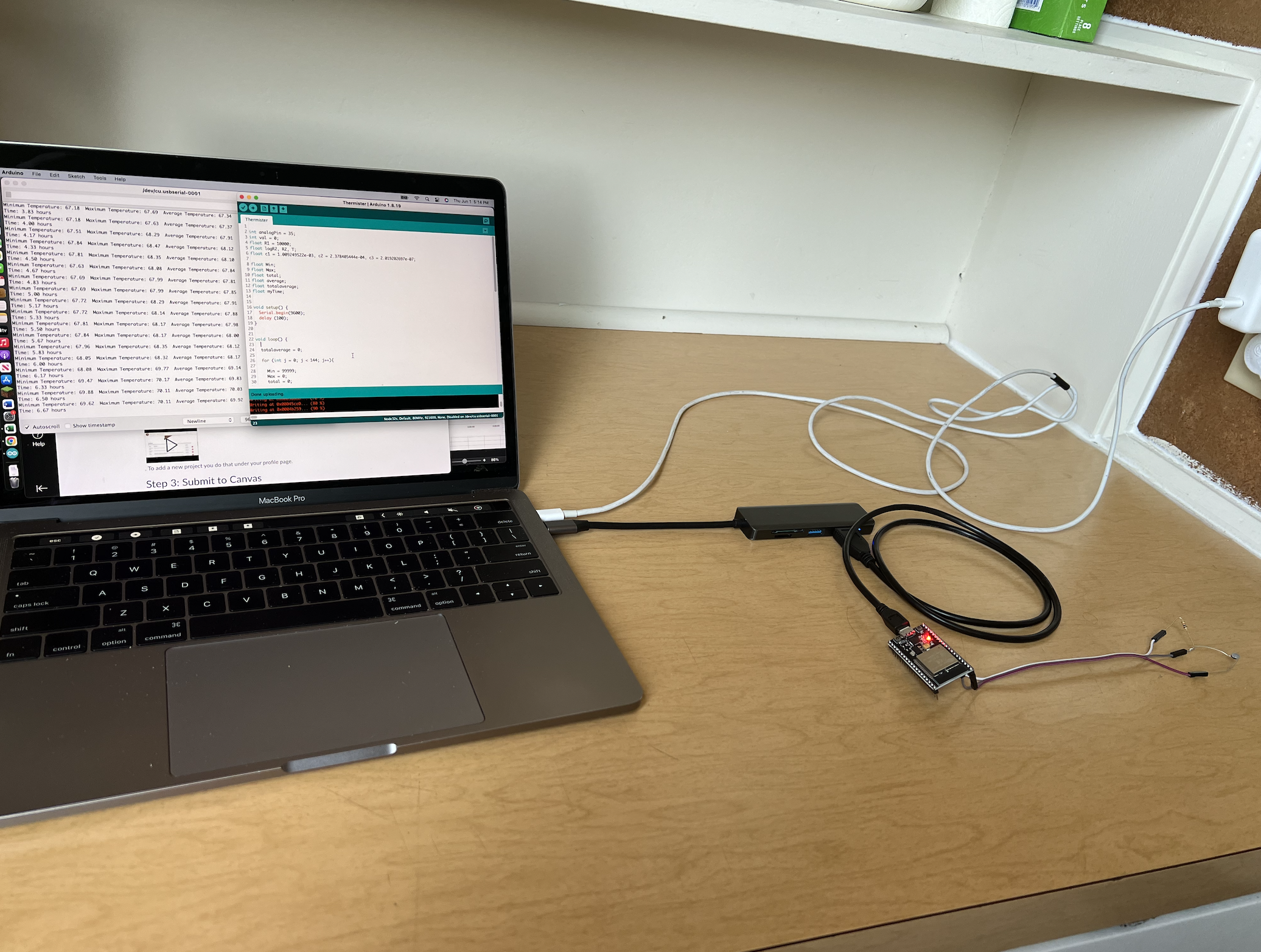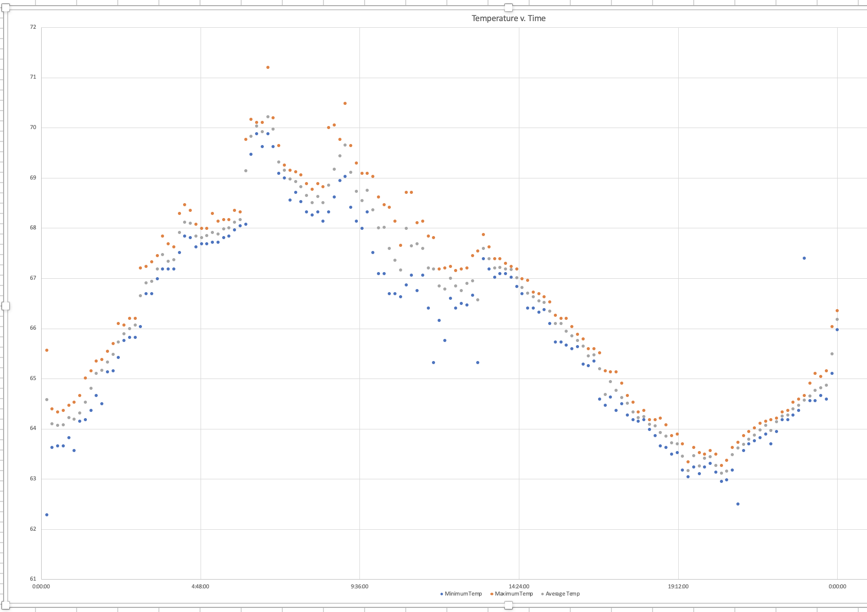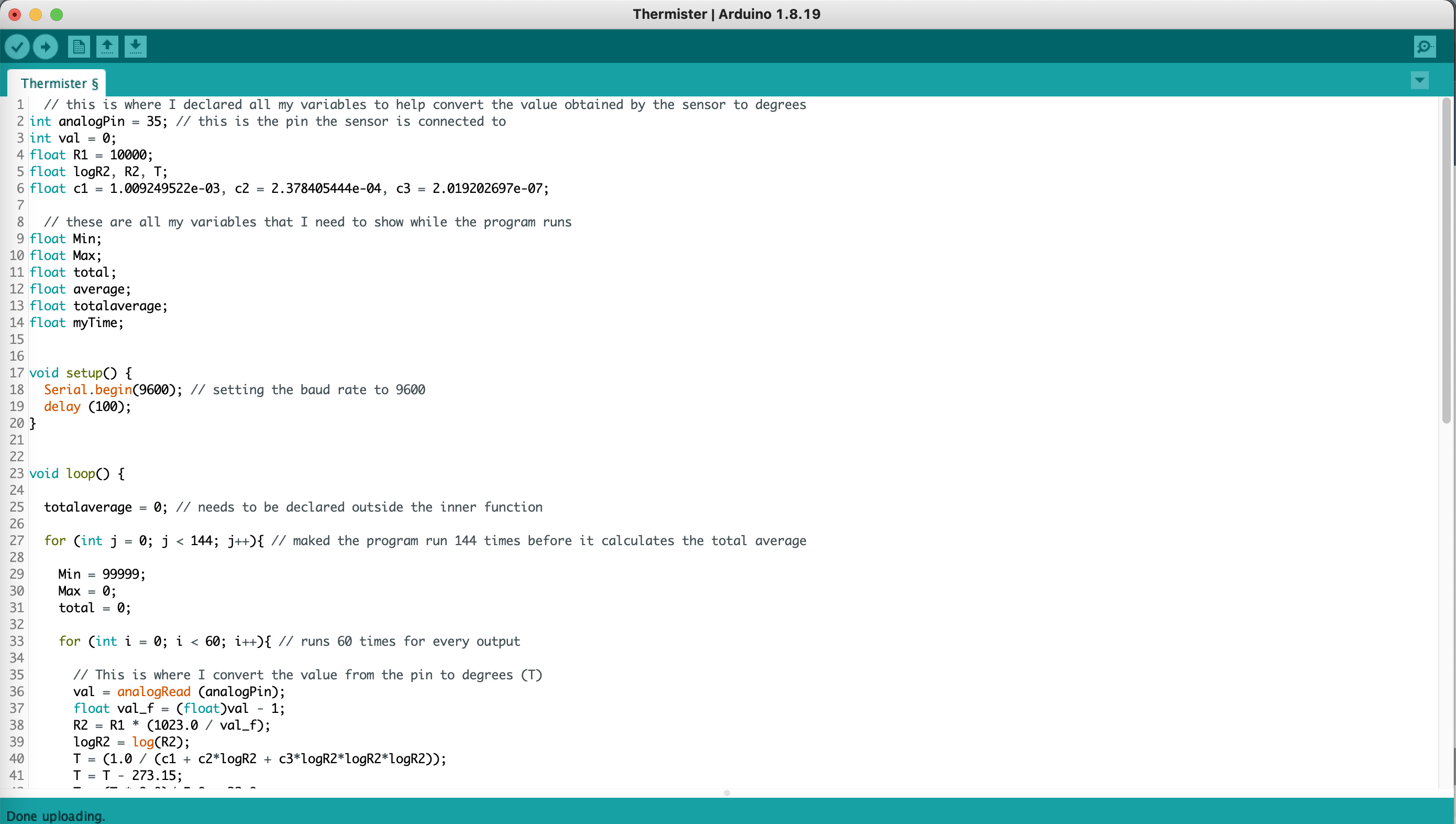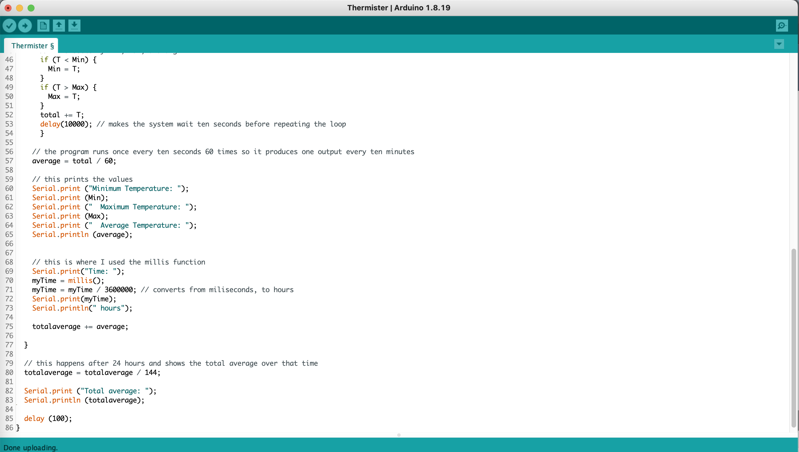 For my final project, I chose to measure the temperature of my room for 24 hours. I measured the area by my desk because that is where I spend the most time while I am in my room. I used a thermistor and Arduino to measure the temperature in degrees Fahrenheit and had it run while connected to my computer which was plugged in for a full day. All of the data I collected was put into an excel sheet and I was able to draw a few conclusions from it. I found that throughout the day, the temperature rose and peaked around 5 pm. It began to fall after that and was at its lowest at around 6 am. From this data I concluded that it was best to work at my desk between the hours of 2-4 pm or 8-10 pm because that is when the temperature is not too hot or cold. I also found that the data points showed more variability from the time where I was at my desk which makes more sense because I was moving around and probably impacted the readings.