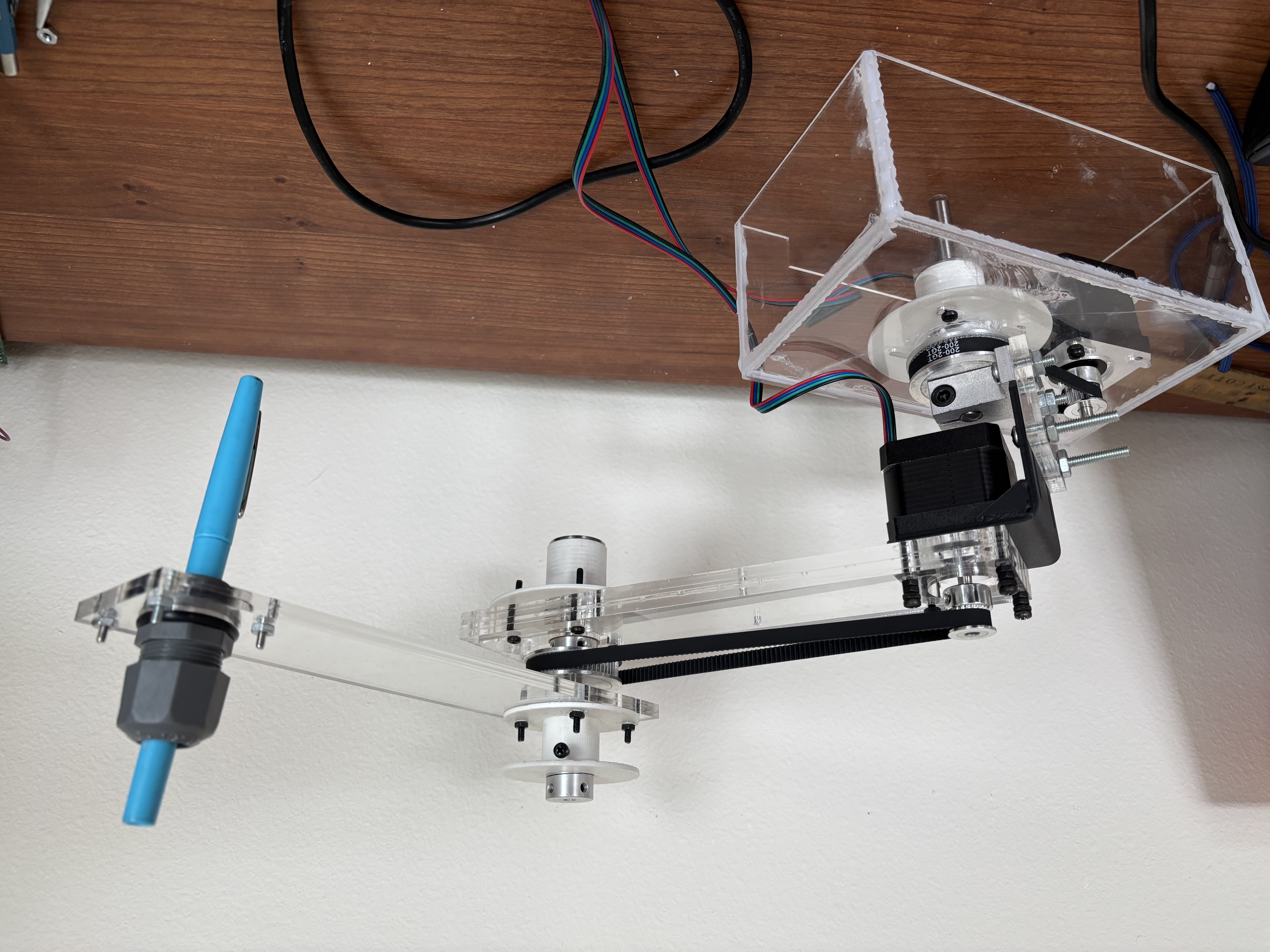 This project involves a two axis SCARA topology robotic arm that can read G-code commands and move along paths defined by the user. The system includes an emergency stop feature and a graphical user interface (GUI) that allows the user to create and edit motion paths using G-code. The GUI provides a simple way for users to enter coordinates, view the path the robot will follow, and send commands to the robotic arm. This makes it easier to control the system without needing to manually write and upload code each time. The robotic arm is designed to perform drawing and positioning tasks with consistent and repeatable motion. Stepper motors are used to control the movement of each joint, and a microcontroller manages the overall operation of the system. The controller interprets the G-code commands and converts them into coordinated motion of the two rotational axes. This allows the end effector to move across the workspace and follow the desired trajectory. An emergency stop button is included to improve safety. When it is pressed, the motors are immediately disabled and the system stops moving. The performance of the system was tested by having the robotic arm draw a straight line that is 10 inches long. The arm is able to complete this movement in less than one second while maintaining a positional tolerance of ±0.25 inches. This demonstrates that the system can move quickly while still keeping a reasonable level of accuracy. Overall, the project demonstrates how a SCARA style robotic arm can be used to interpret G-code commands and perform controlled motion along a defined path.