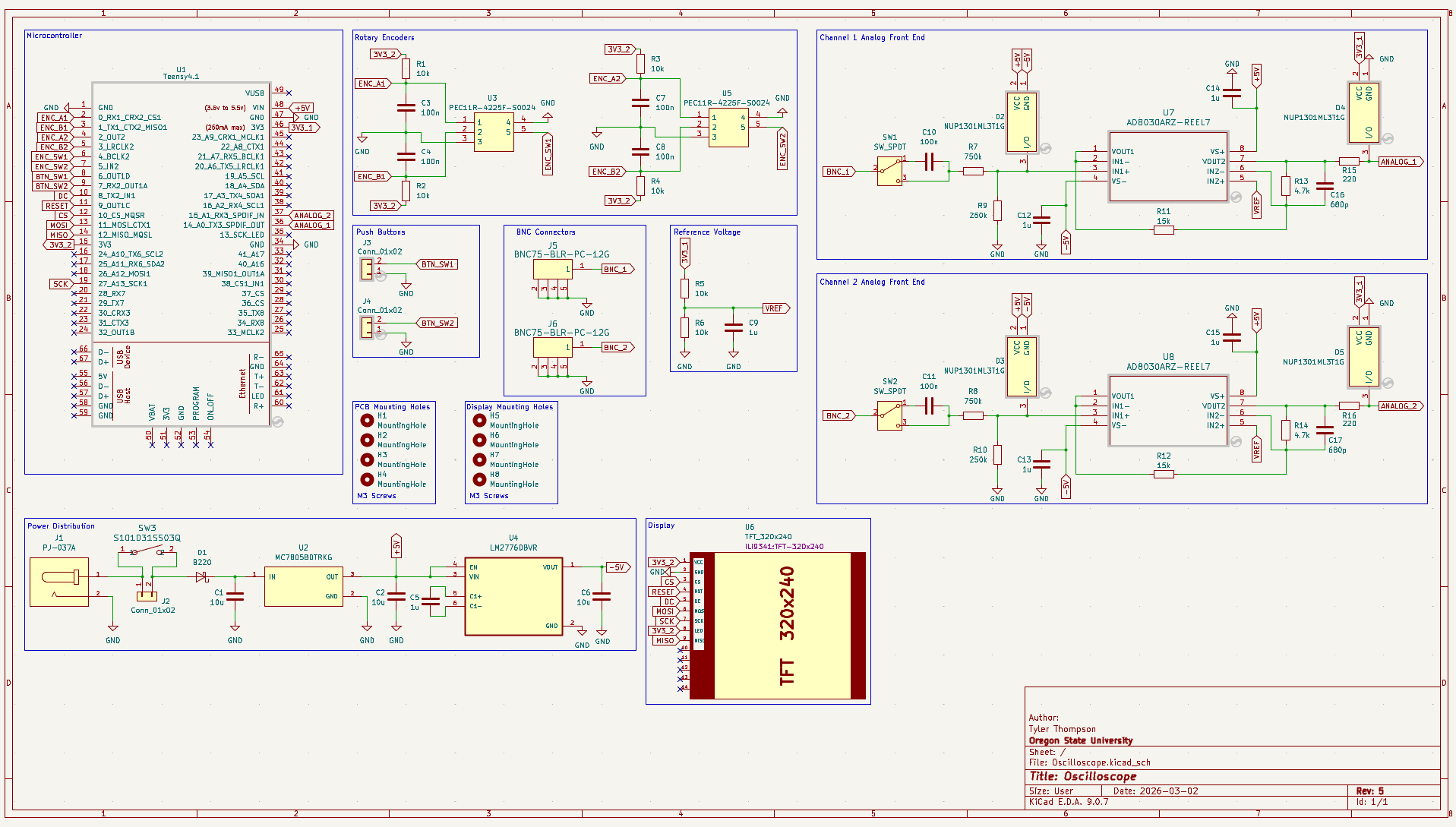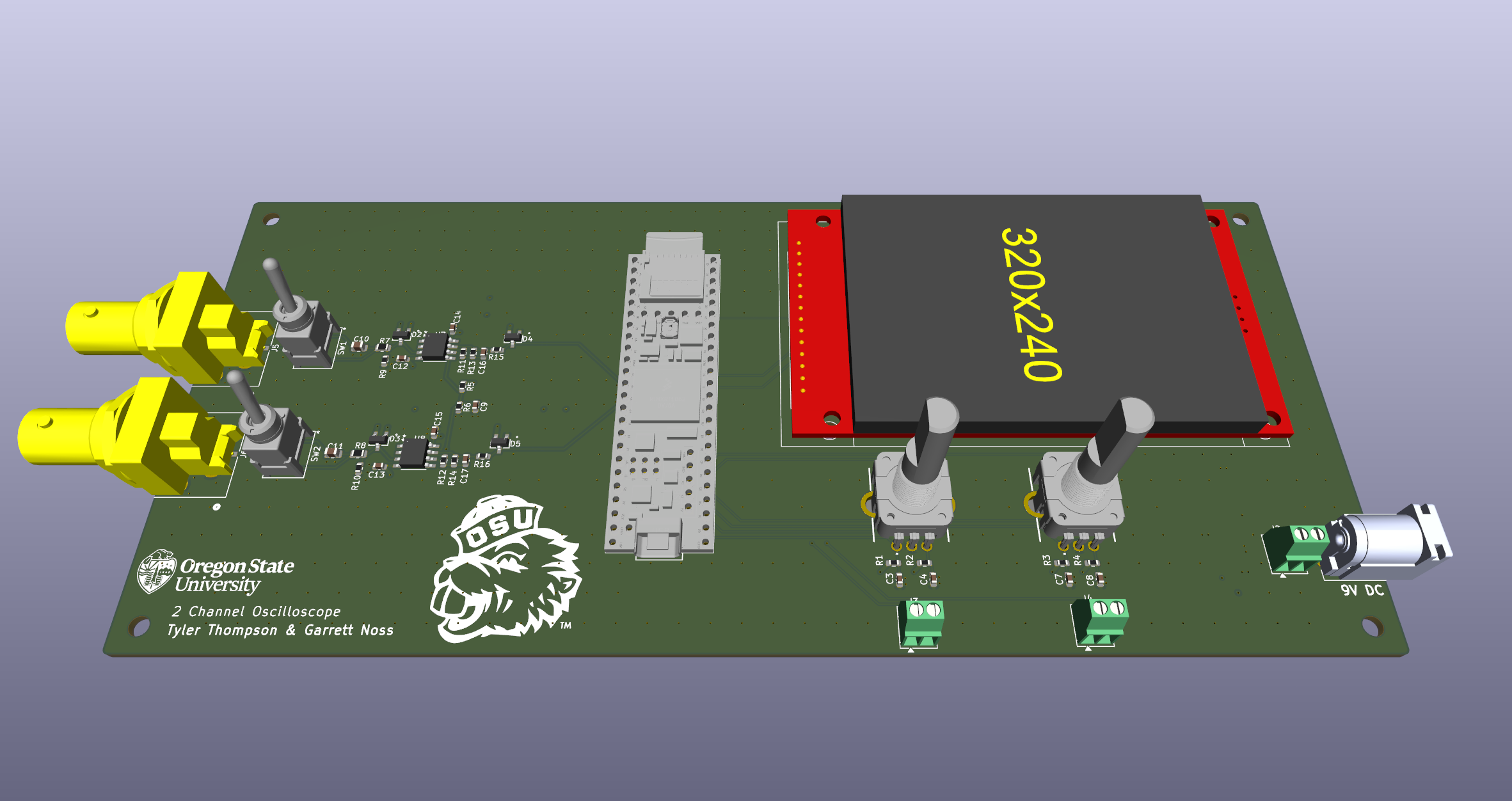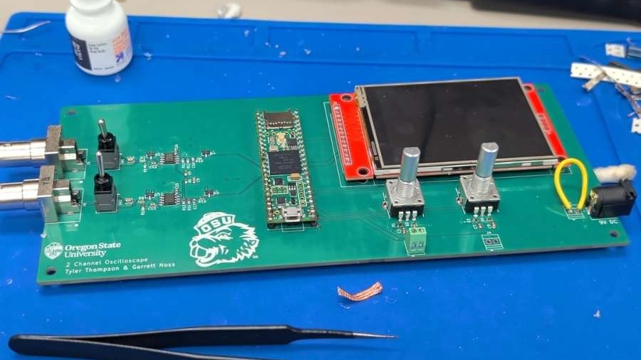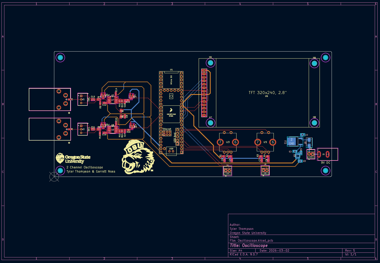 A portable O-scope system is designed to capture, process, and display electrical signals from external probes in real time. The system allows users to see waveform behavior and measure signal characteristics. O-scope supports two 9Vpp 200kHz channels operating simultaneously and provides an interactive user interface allowing adjustment of measurement parameters.