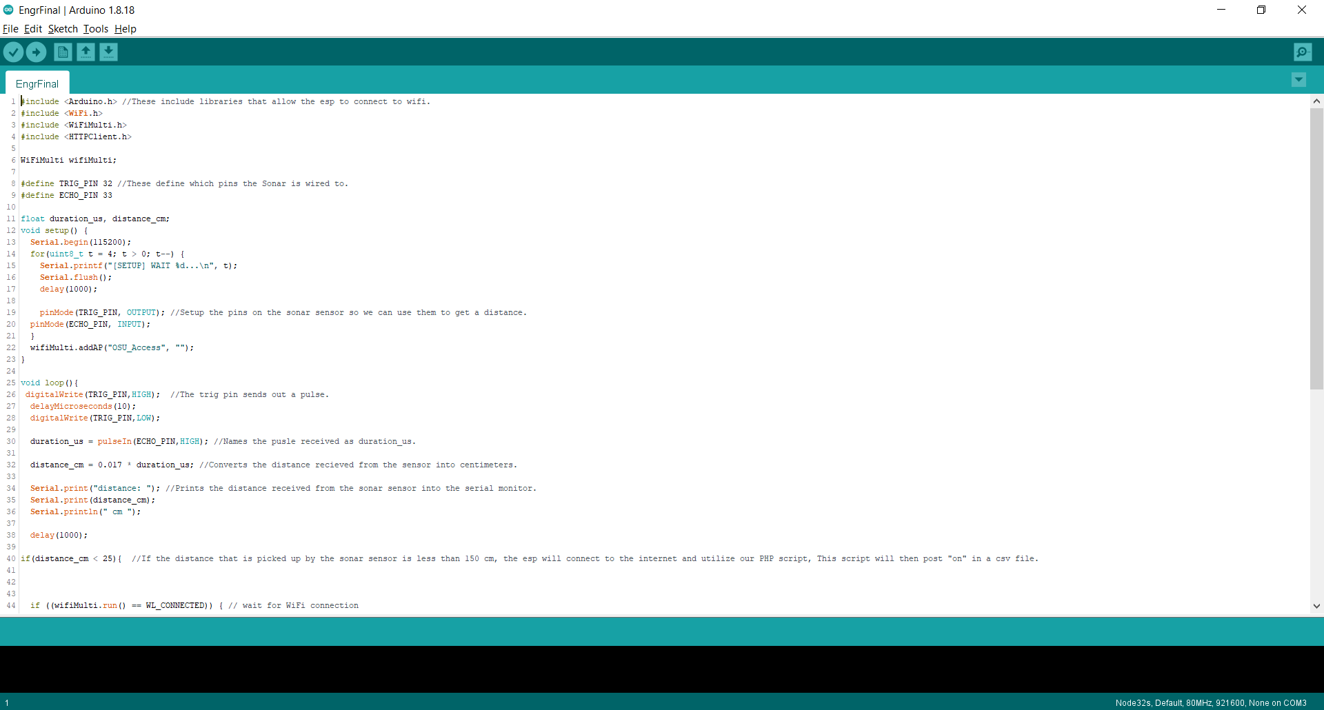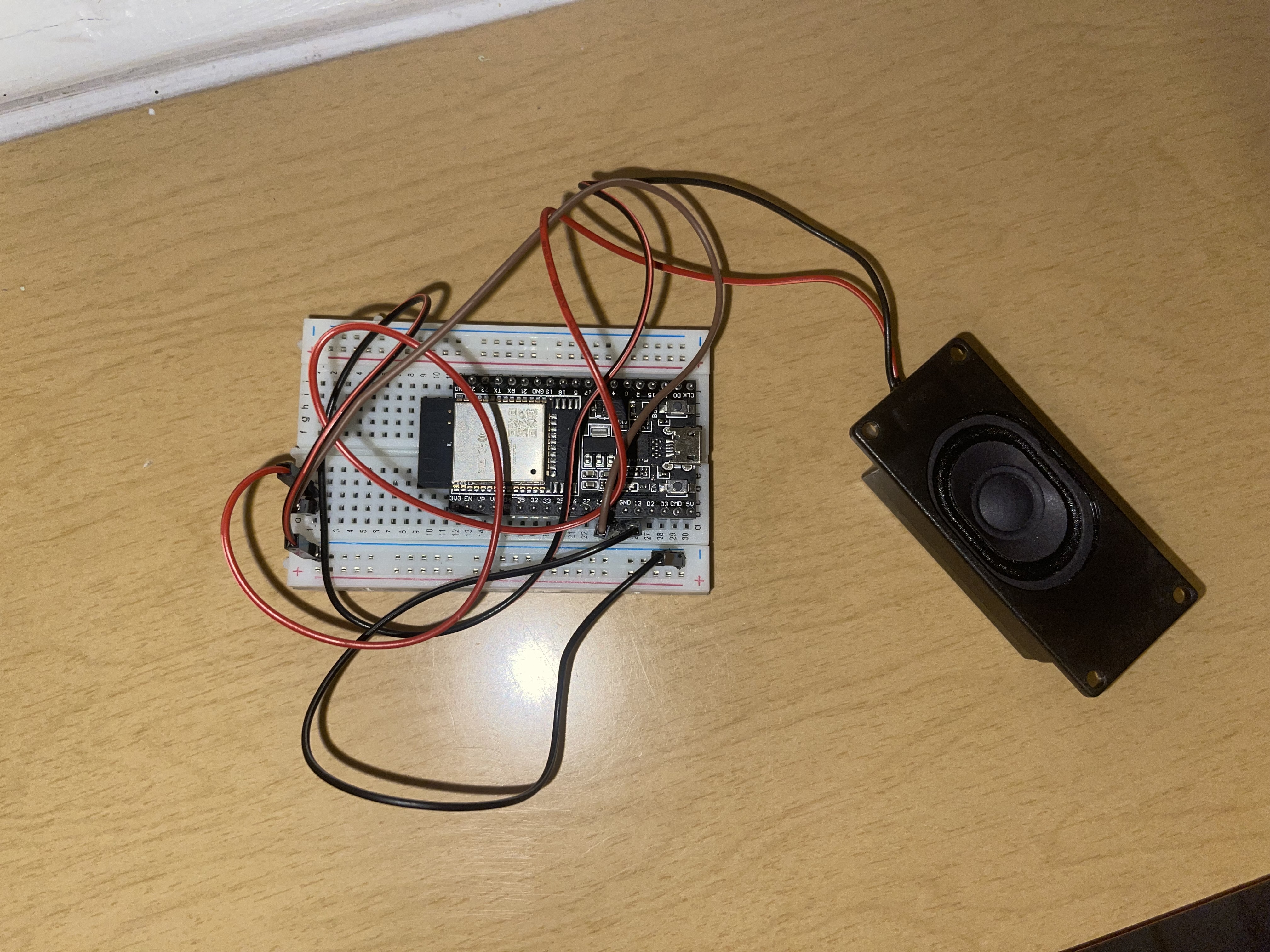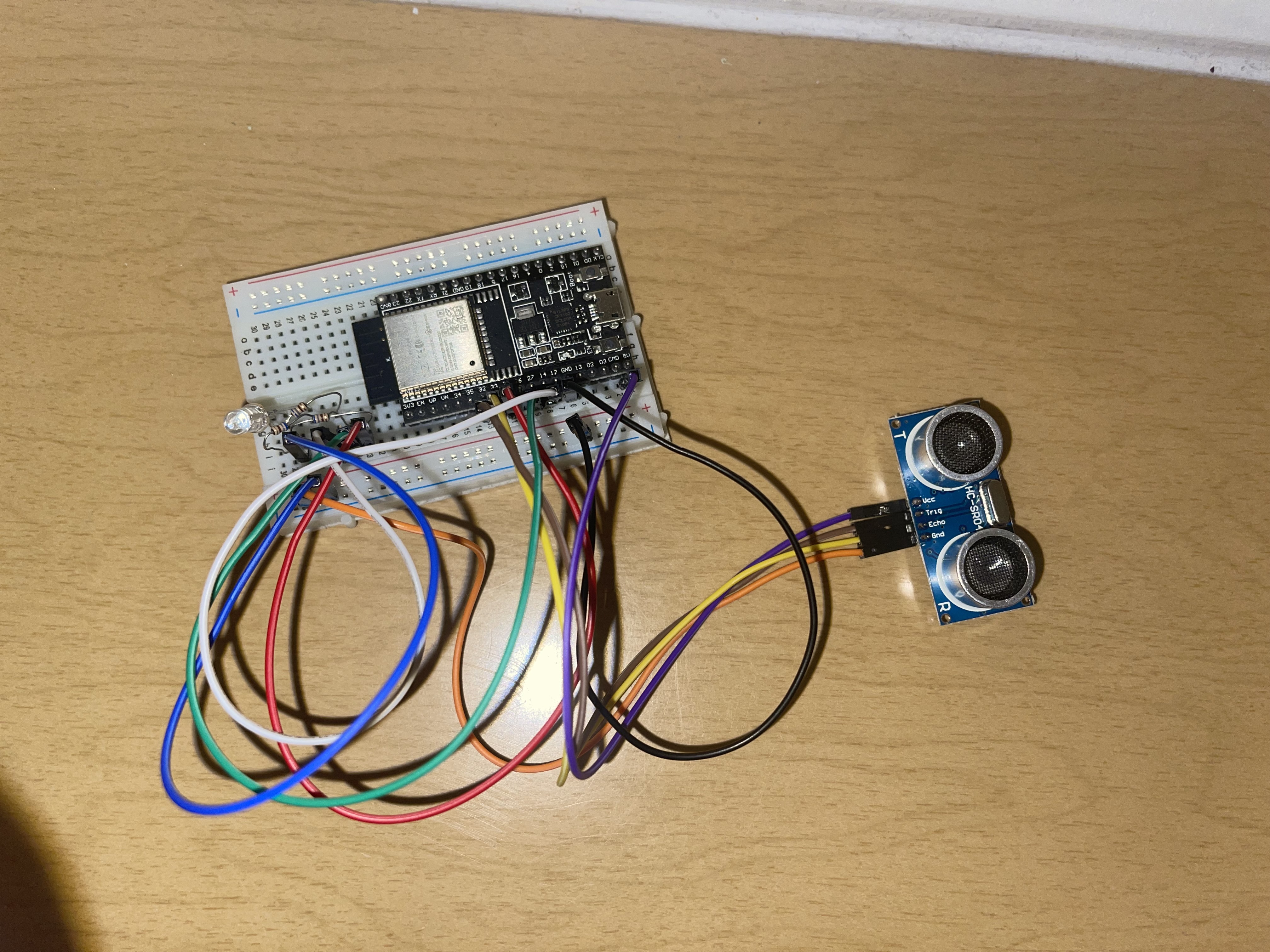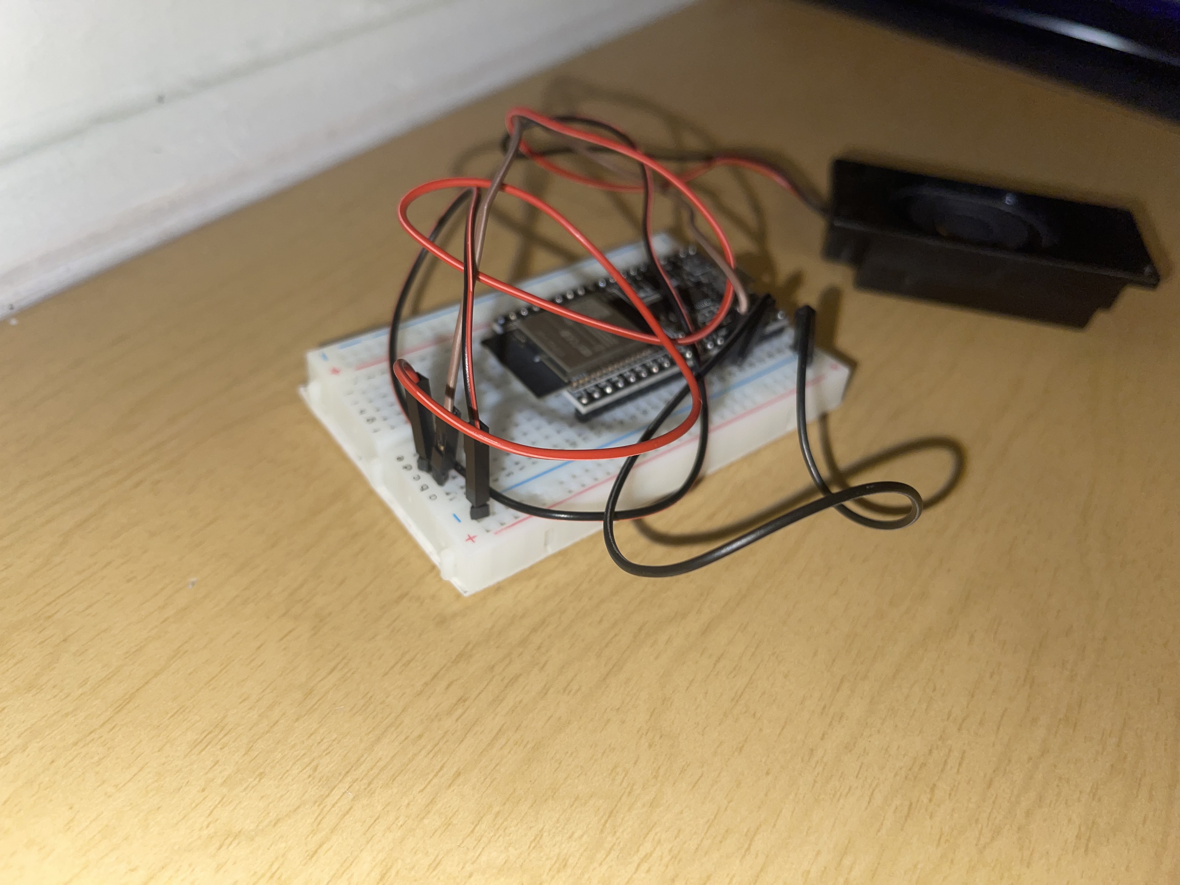We have designed a door alarm which will trigger as soon as the door(s) being watched is opened. The way we set this up is by using an ESP32 wired with a Sonar Sensor to watch the readings from above the door looking downwards. Once the alarm is set, it will be reading the distance from the top of the doorframe, down to the floor. This height is an average of 200cm. In order to give it some buffer room to not go off if something small happens to just walk by, we set the sonar to send "on" to the webspace if the sonar has detected something less than 150cm away. Now, a second ESP32 connected to a 5v Speaker is placed in a location in which you can hear it. this ESP32 is constantly reloading the webspace, looking for that "on" to be posted. As soon as it refreshes, and sees "on" it will beep a constant note 16 times (tone and count may be increased with ease).
