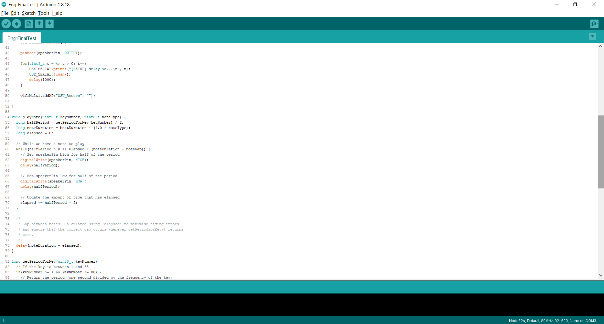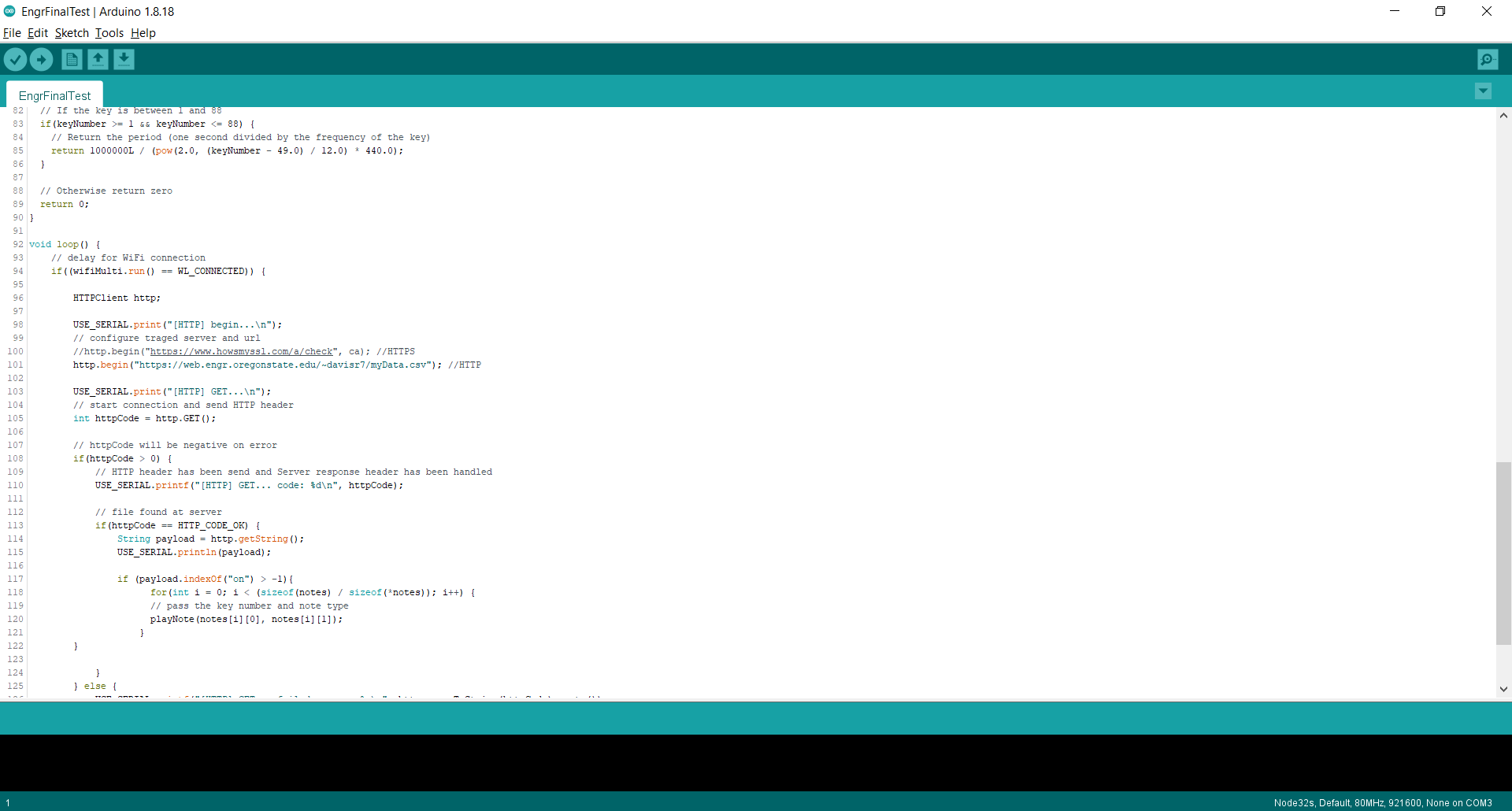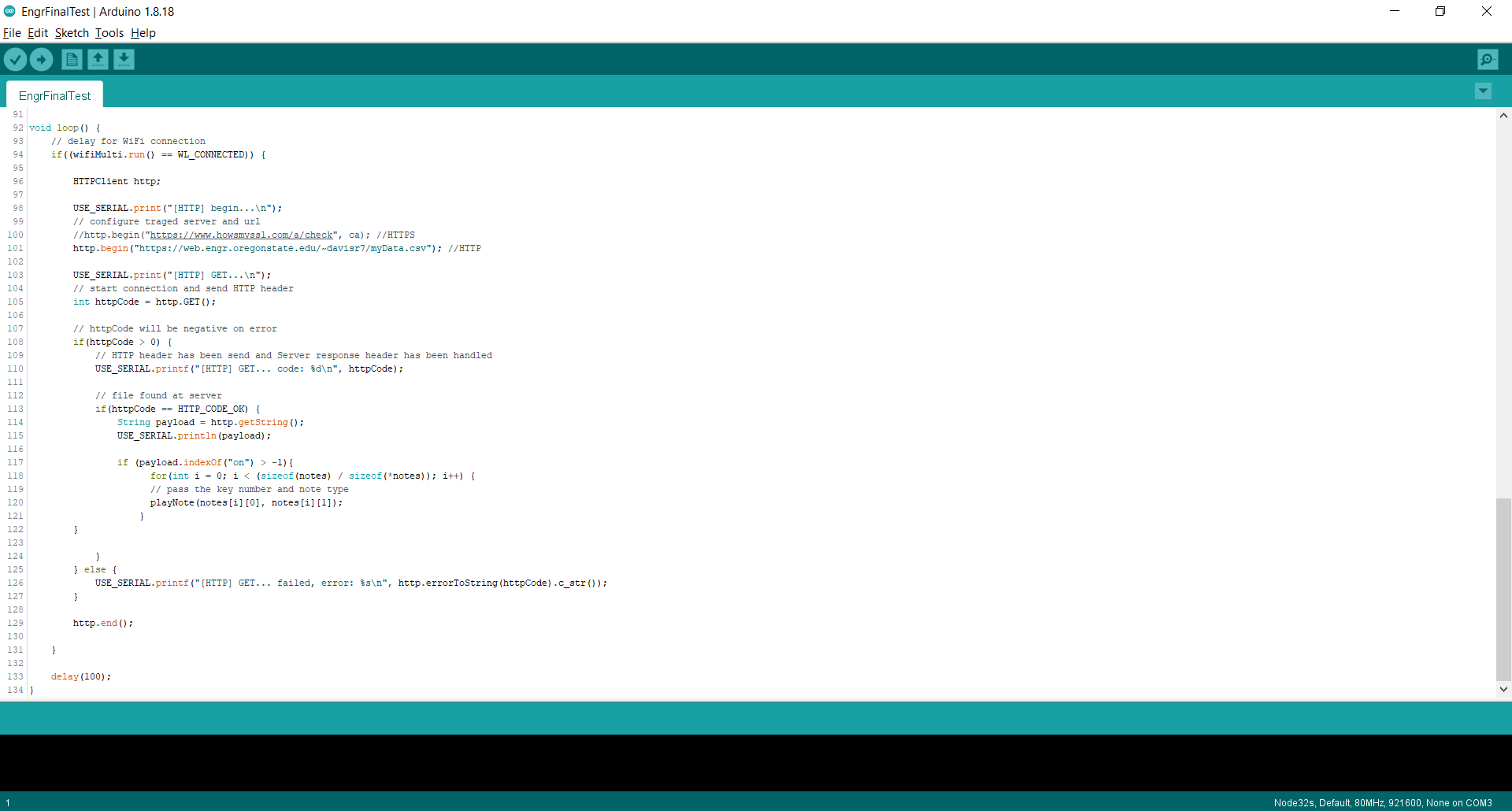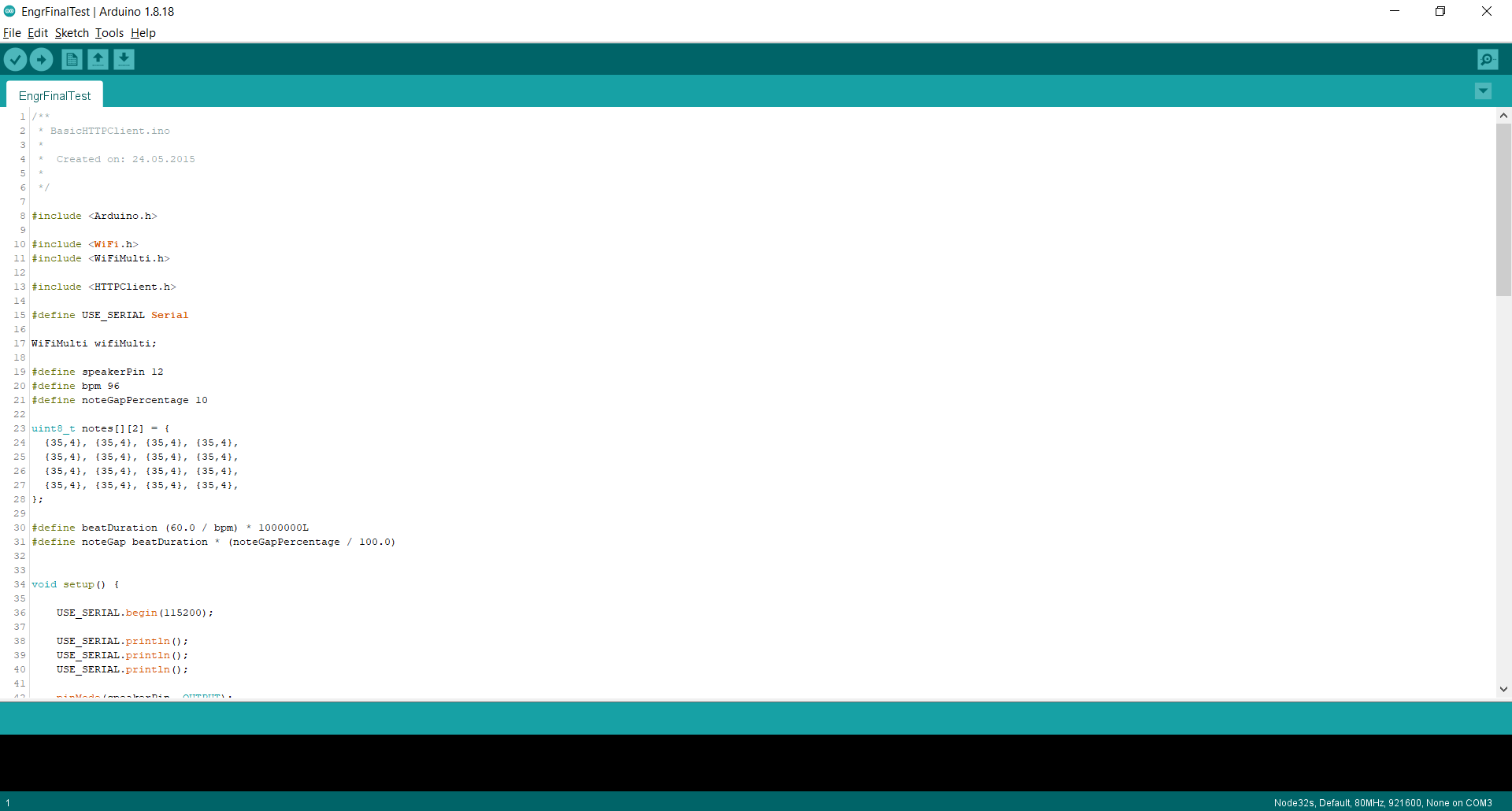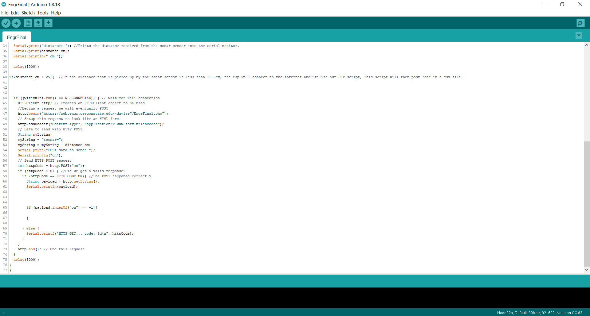 We have designed a door alarm which will trigger as soon as the door(s) being watched is opened. The way we set this up is by using an ESP32 wired with a Sonar Sensor to watch the readings from above the door looking downwards. Once the alarm is set, it will be reading the distance from the top of the doorframe, down to the floor. This height is an average of 200cm. In order to give it some buffer room to not go off if something small happens to just walk by, we set the sonar to send "on" to the webspace if the sonar has detected something less than 150cm away. Now, a second ESP32 connected to a 5v Speaker is placed in a location in which you can hear it. this ESP32 is constantly reloading the webspace, looking for that "on" to be posted. As soon as it refreshes, and sees "on" it will beep a constant note 16 times (tone and count may be increased with ease).