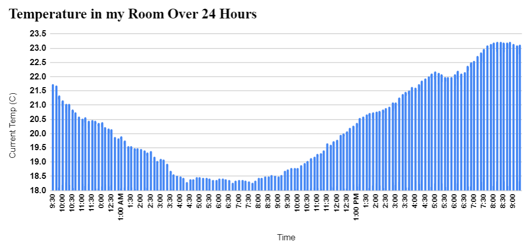 What I chose to measure for the final assignment for ENGR 103 was the temperature in my room over the span of 24 hours. I did this using an LM75a sensor wired to an ESP32 board plugged into my laptop. Every 5 seconds it outputs the current temperature in my room and every 10 minutes it outputs the highest, lowest, and average temperature. I placed my laptop in the corner of my room where it sat untouched for 24 hours so there would be as few errors as possible. After the 24 hours were over I copied and pasted the data that was collected through the serial port to a Google sheet where I labeled and graphed it. The main thing I learned from this experiment is that when my Desktop is turned on the temperature rises about 1 to 1.5 Celsius over what it usually is because the heat produced by the PC is so great. Something else I learned is that the sensor I was using wasn’t soldered correctly or that one of the connections was bad because it did occasionally output the current temperature as -1,000 Celsius which meant there was an error in the reading due to hardware. Next time I need to collect data I should implement something into the code that dismisses the error values and doesn't count them toward the final average. Another thing I would change next time is placing the sensor in a more volatile place so that the data is more interesting and a cooler conclusion can be produced. On that note what I was able to conclude from this project is that from 4:00 AM to about 8:00 am the temperature is at its coldest and day to day the highest/lowest temperature can vary heavily.