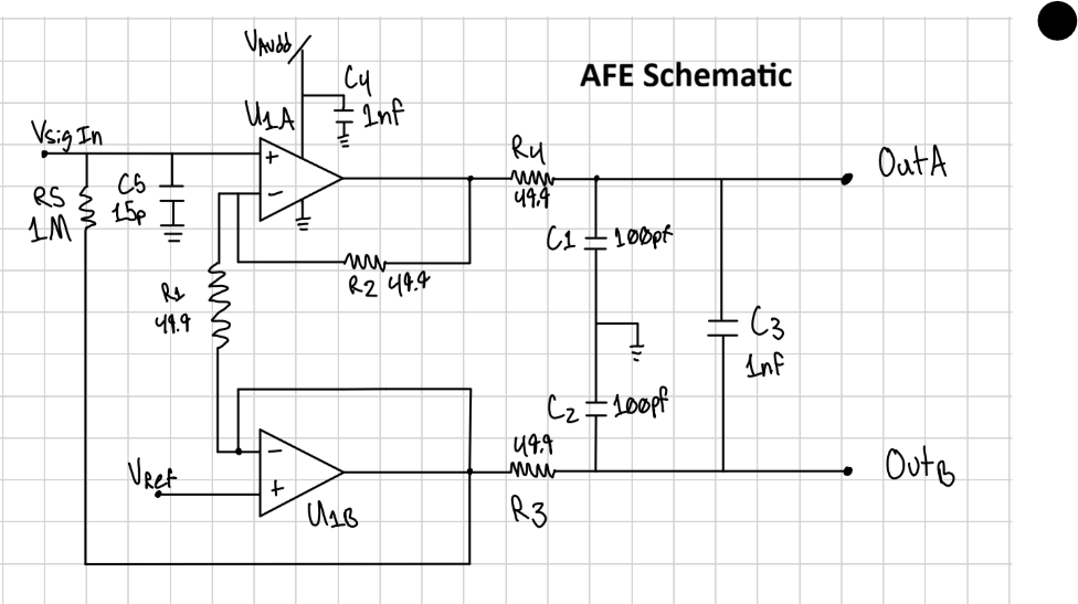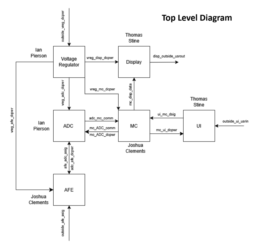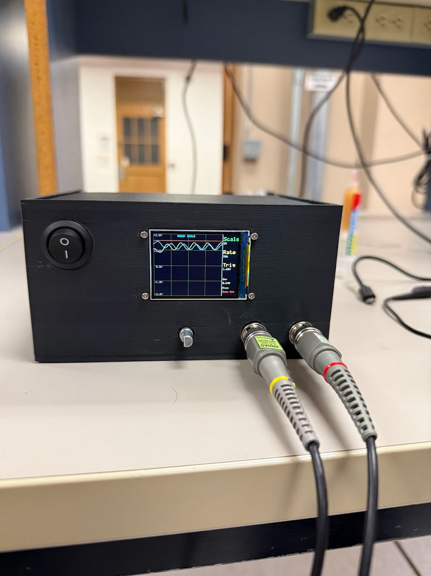 This is a Raspberry Pi Pico 2-based portable oscilloscope that runs on a single 9V battery. It is designed for a lab setting, to measure up to two channels at a maximum polling rate of 250kHz. The brain of the system is the Pico, which handles outputs from the ADC and the UI, runs the code, and outputs to the LCD. Behind the hood, the AFE (analog front end) is smoothing and scaling the raw input signal, and sends it to the ADC (analog-to-digital converter). The AFE allows the user to input an analog signal in a range of -10 V to 15 V using a 10x attenuation probe. The ADC then converts that to a digital signal, which can be processed by the Pico and displayed as a waveform on the LCD. Some big accomplishments from this project include significant chip debugging, technical soldering, and pushing the limits of our code. Our Engineering Requirements: 1) The system will have at least two channels that can function simultaneously and independently. 2) The system must connect and disconnect from the oscilloscope probes using robust connectors. 3) The system must include a configurable trigger, adjustable time, and adjustable voltage axis. 4) The system must respond to user input in under 100 milliseconds. 5) The system must sample at a rate of at least 200 kHz independently on all channels. 6) The system must be battery-powered. 7) The system must be able to power on and off.