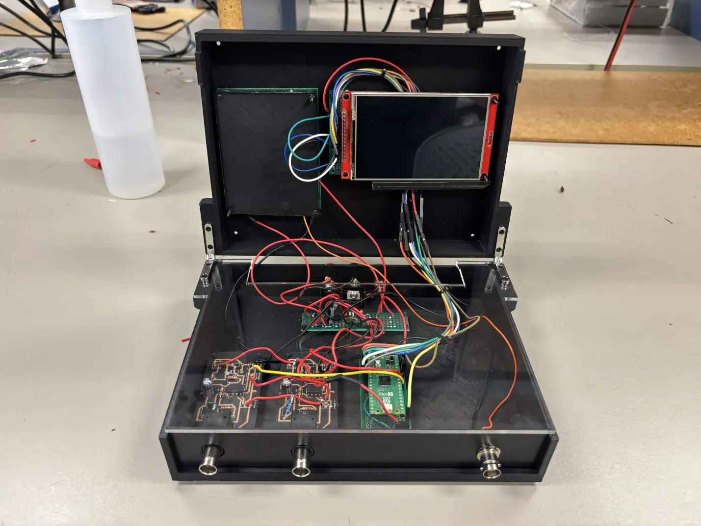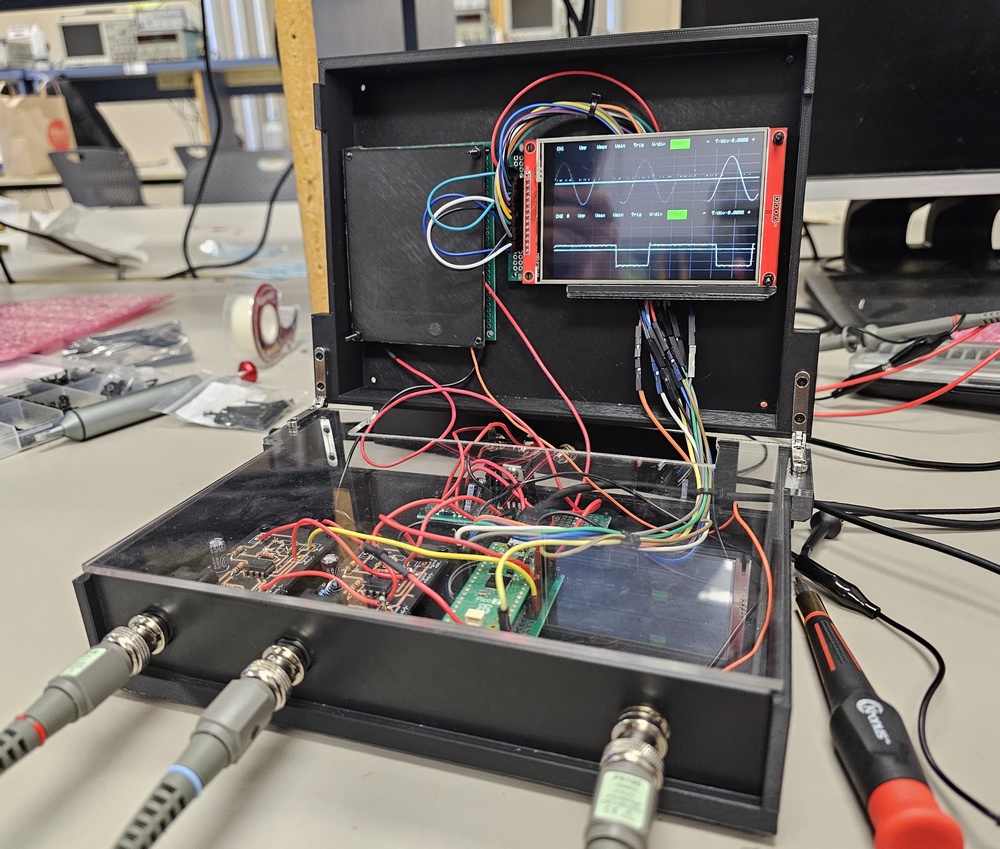 The FlipScope is a collaborative project by three students to design a compact, portable two-channel oscilloscope capable of displaying signals up to 12 Vpp and 125 kHz on a 4-inch LCD touch screen. A unique aspect of this design is its laser-cut transparent acrylic protective layer, which allows the internal circuitry to remain visible. The main modules can be seen through this layer, highlighting the device’s internal structure. The oscilloscope also features an open-and-close lid mechanism that uses mechanical hinges, enabling users to access and view the internal components while maintaining protection when closed. Additionally, a custom PCB was developed for signal processing and to provide two robust probe connections. These connections allow oscilloscope probes to securely attach to the FlipScope and send signals to the device for processing and display. Furthermore, a square-wave signal generator is built in for the user to tune their probes. Users can interact with the touchscreen interface to adjust oscilloscope settings according to their preferences. Future improvements include making the circuitry more compact, as the current components are somewhat spaced apart. Designing additional custom PCBs could help reduce the overall area of the electronics. Other enhancements may include improving cable management between the lid and the main circuitry, as well as developing a distinctive logo for the device.
