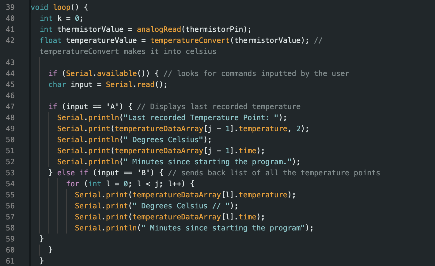 In this project, I recorded the ambient temperature of my room for 24 hours. I used a thermistor to measure the ambient temperature. The way the program works is that it reads the thermistor data once per minute, and once it gets 10 readings, it saves that as a data point in degrees Celsius alongside time. After 144 readings, we get 24 hours of temperature data. To calculate the temperature, we took the reading and plugged it into the Steinhart-hart formula with values that were calculated before recording. To get these values, I matched the thermistor readings with the outdoor temperature, and used MATLAB to calculate the constants for the formula. The code also has a few functions, like the ability to print the last recorded data point in the serial monitor as well as print a list of all of the recorded points since the start of the program. It ends itself by entering a while 0 == 0 loop as to stop recording more data, and prints out the final list of data. Video: https://drive.google.com/file/d/1MzNlZAm9dPqXklsQ35XdaRxgiZvCtMvO/view?usp=sharing