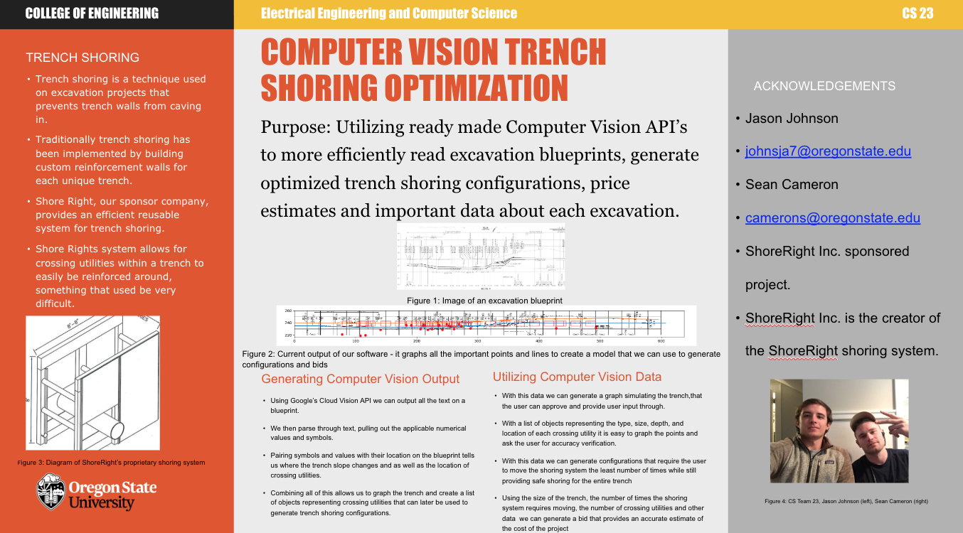 Summary: Generating a bid off of an engineering drawing is a days to weeks long process for contractors. Our software was born of necessity to reduce this lead time. The overarching goal of this project is to generate the most efficient trench shoring configurations for a given excavation/new install of underground utilities given data collected from the engineering drawings using computer vision. Trench shoring is the act of reinforcing the walls of a trench to prevent collapse. From these configurations, we will use data collected from engineers and contractors in the underground industry to generate an estimated expense and time needed for an underground utility install using conventional shoring methods and an install that also incorporates the ShoreRight trench shoring system. The final results are then calculated to provide the user with a trench shoring configuration for the entire trench as well as the back fill for the entire trench. Workflow Explained: Our software begins with the engineering drawing of a single excavation site. From this engineering drawing we can use computer vision to extract almost all of the information we need to generate a trench shoring configuration. Once our software is running, the user will immediately be prompted with the values extracted by the computer vision from the engineering drawing. The user will be able to review and edit these values if there are any discrepancies. The user will then be presented with a simulation of the trench pictured in the engineering drawing. To continue, the user must click across the graph at the ground elevation. This is made simpler by following the dotted line in the underlying engineering drawing. Now the user can exit the simulation window and the software will use this user-input to generate the final shoring configuration. Once the simulation window is exited, a new window opens showing the ground level & trench floor, the location of all crossing utilities in the trench, and optimal placement of shoring. First Image: Provides an overview of the purpose and value of the project as well as a general overview of the implementation. This can also be downloaded in the artifacts section. Second Image: The raw data corresponding to the prior picture. This raw data has the start and end coordinate, size of shoring, type of shoring, and the number of shoring devices needed to be stacked on each other. Third Image: Example of an engineering drawing that can be used as the input file to our software. Fourth Image: Ability for user to edit the raw computer vision output is shown. Fifth Image: Provides the final shoring configuration output. Picture two creates a horizontal view of the specified trench and the optimal location of the shoring. Sixth Image: Zoomed in view of the trench shoring configuration, shows how the different trench shoring boxes fit around the crossing utilities (red dots) This project was proposed by team member, Sean Cameron, as a part of his broader work. The technical details are under strict NDA. For more information, please contact him directly at camerons@oregonstate.edu or see his associated work at https://shoreright.com/about/. The project mentor is Joe Louis, PhD, Civil Engineering, OSU. Special thanks to the collaborative efforts of Michael Carr - Branch Manager Murray Smith and Associates, Brandon Farmer - Project Manager Tapani Construction, Casey Lipe - Superintendent Tapani Construction and Tanner Whickwire - Project Manager Pacific Excavation