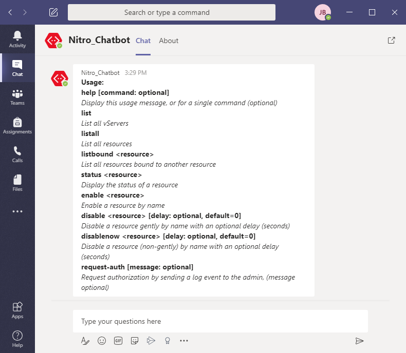 Our project, Nitro Chatbot, is a chatbot that allows network administrators to change configurations on a piece of network hardware called a load balancer. A load balancer is a piece of network hardware that exists between the internet and a group of servers that work together to serve a webpage that you view. When you navigate to Google, you’re really asking a load balancer somewhere to route your request to one of many servers that Google operates. A load balancer something acts as a traffic signal at an intersection, directing traffic to their destination and reduction congestion. Load balancers need to be configured and monitored by the people responsible for them. At Oregon State University, this process can be fairly cumbersome. Our project streamlines this process by using a chat program called Microsoft Teams that all university employees have access to. With this, we can make sure only authorized employees can perform common tasks quickly and easily, saving them time and the university money. Given the sensitivity performing changes on such a critical piece of hardware, security was a primary focus of the project. Nitro Chatbot leverages the built-in authentication of Microsoft Teams to authenticate the identity of users without an extra step. Additionally, to separate the chatbot from interacting with the load balancer itself, a second component project was developed. This relay performs the sensitive task of querying the load balancer while assuring all its requests are only received from the chatbot component. Our project highly relies on AWS (Amazon Web Services). Both components are hosted in EC2 instances behind a domain (nitrochatbot.com), allowing for encrypted communication via HTTPS. Load balancer credentials are safely stored in AWS SecretsManager. Logs of all interactions are stores in AWS CloudwatchLogs to allow for simple auditing of user actions. Finally, the whole project stack can be deployed to AWS in a single step with the included Cloudformation Template.