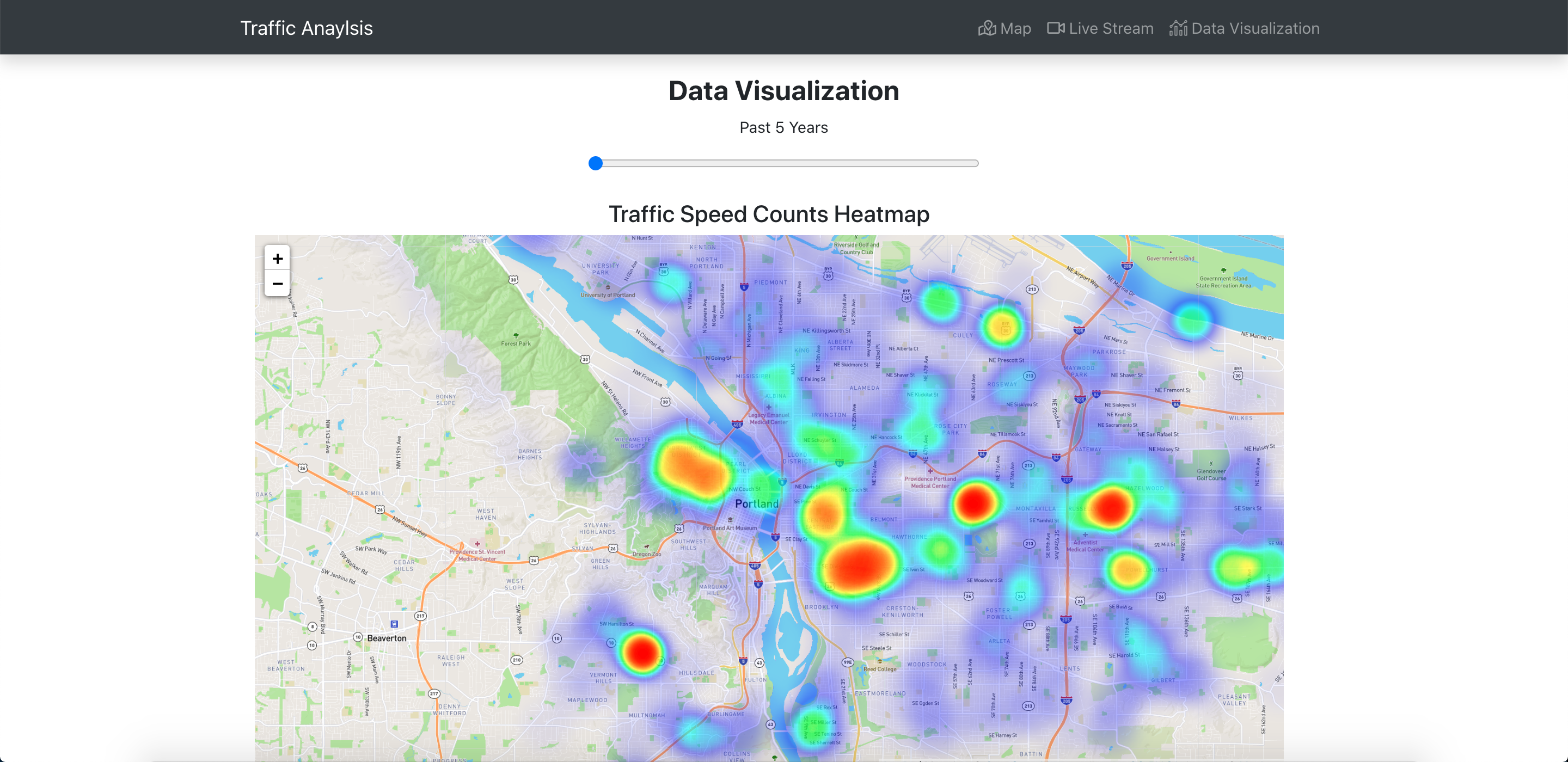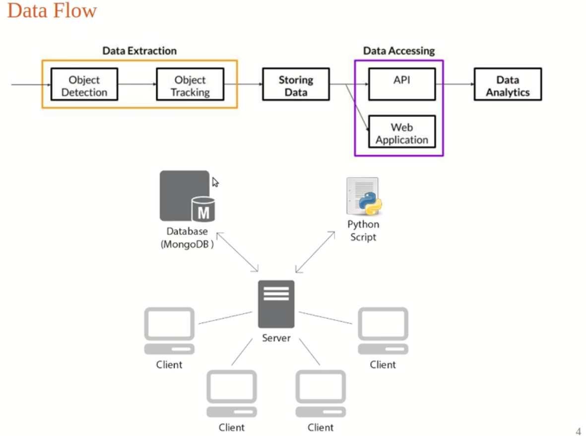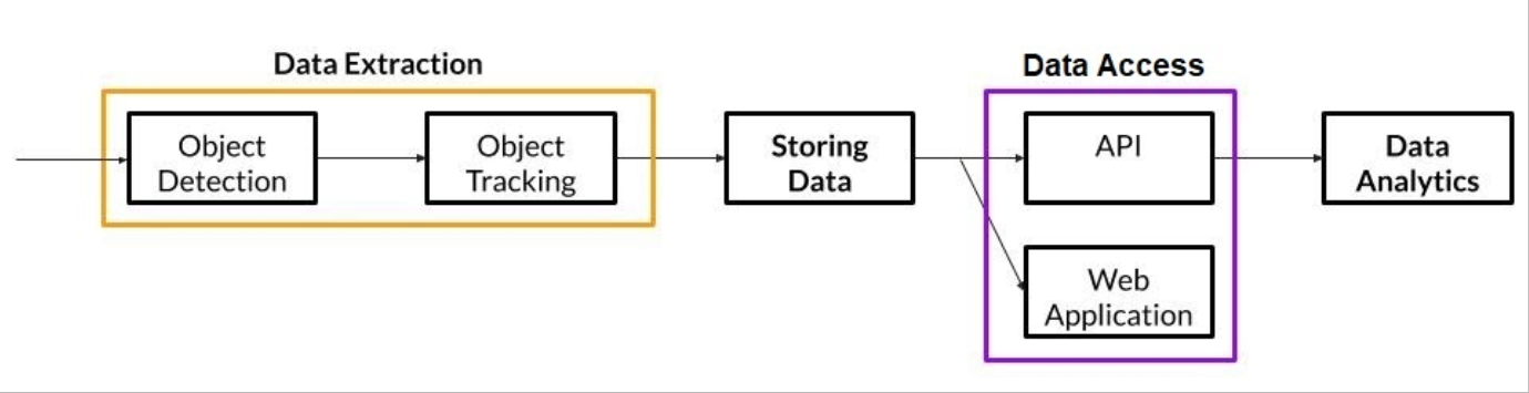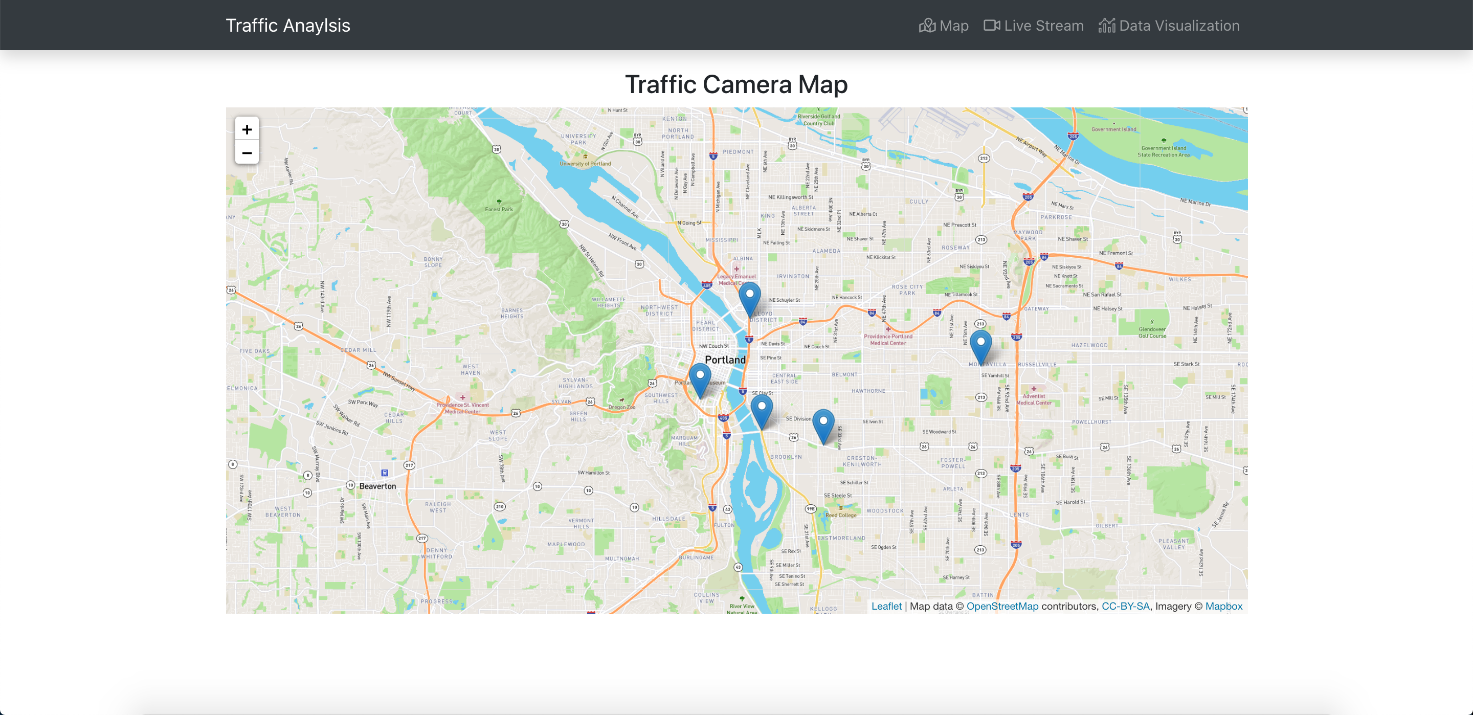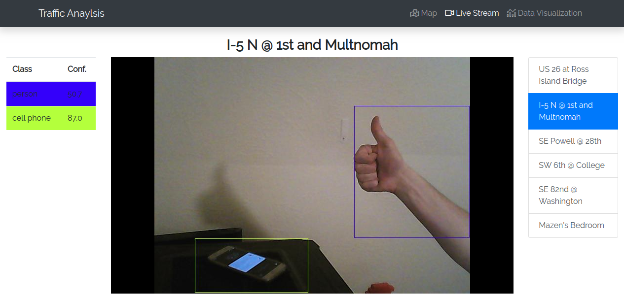 We collaborated with the City of Portland to create a system which takes live traffic camera footage and can automatically extract useful data from it. This was accomplished by using object detection and tracking models to be able to detect and track relevant objects such as cars, pedestrians, motorcycles, and other objects. We then developed a user-friendly web interface which displays live output from the detection and tracking models. Screenshots of this system in action can be seen below as well as more details about both the models and the web interface. The object detection model utilized YOLO-V3 pretrained on the MS-COCO dataset. This allowed us to be able to detect all the categories of objects we needed and offered fast performance even on edge devices. The object tracking model took advantage of a LSTM (long short term memory) model which was developed by Chanho Kim. It allows for tracking of objects even after short obscuration. We were successfully able to run these models sequentially, meaning that the output of the object detection model could be fed directly into the object tracking. Work began to allow these models to run concurrently as would be required for real-time operation and we hope this work will be continued next year. The data flow starts by running the Node server, which is connected to multiple clients as can be seen in Figure 2. The server then runs a Python script to process the video feed as a background task. As the Object Detection/Tracking model is processing the video feed, two main types of data are being extracted and sent to the server: the frames and the objects detected within them. Each frame is then sent to the server to be broadcast in real-time to all available clients. UI Interface Design: We decided to use MongoDB because it is a NoSQL database, which provides more flexibility for both current and future development. The objects detected in the frame have some key pieces of information that we are storing in our database: the Class Name (i.e., car, person), Confidence (i.e., how confident the AI is that it classified the object correctly), Bounding Box coordinates/dimensions, Timestamp, Camera, ID. Overall, this goal of this project was to help the City of Portland utilize deep learning and a straightforward web interface to acquire a new tool with which to analyze current traffic conditions and patterns around the city. Future goals for this project include further data analysis to incorporate features like collision prediction as well as making the system more robust and accessible to City of Portland users.