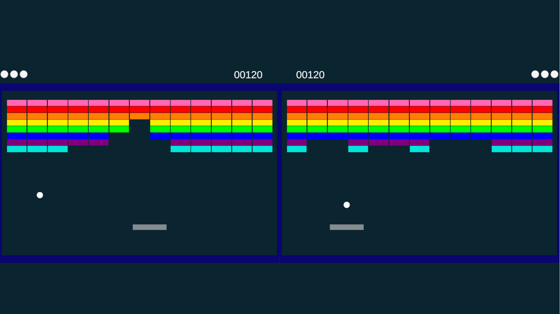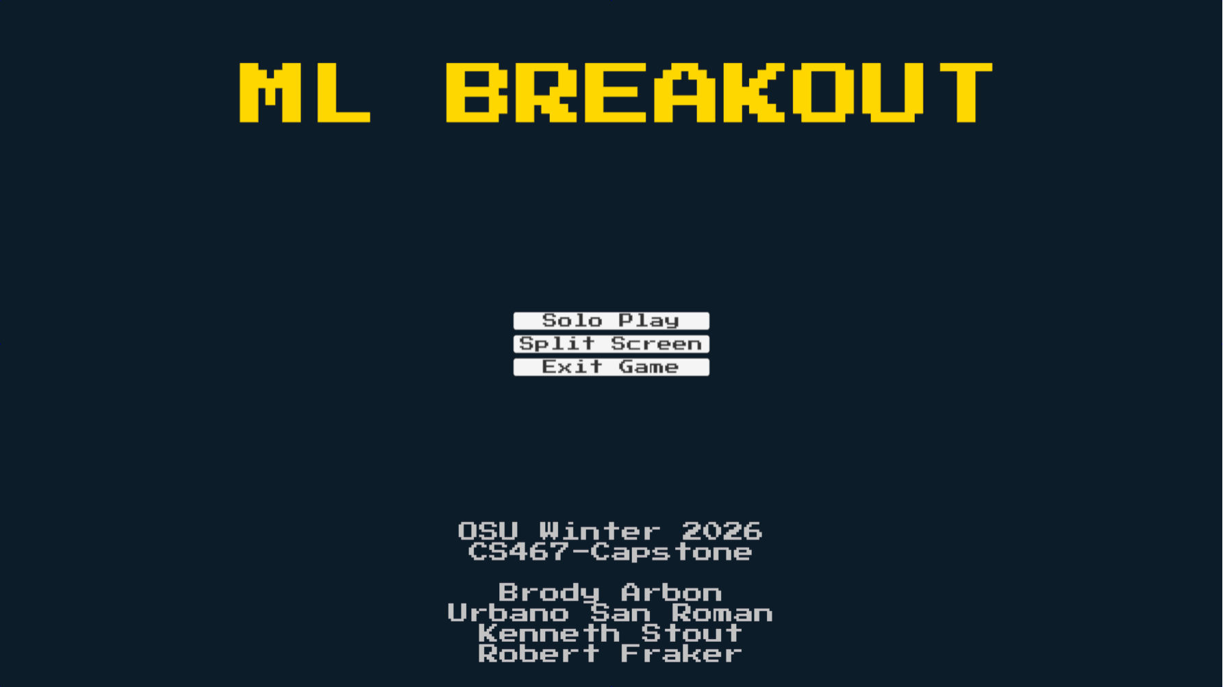 We completed our own breakout-style game which features single player and a split screen mode in which you play against an ML agent we have trained via reinforcement learning. What this entails is giving rewards to our agent for positive behaviors like hitting a brick, hitting the paddle, or keeping the paddle close to the ball. The agent seeks to maximize these rewards, so as the iterations go on it, more and more positive behaviors are created. The game also enables the user to select between easy, medium, and hard difficulties that adjust ball speed and paddle size. On top of that, the user can select between a variety of Agents from 1, 2, and 3. Each have unique behaviors due to the differences in training listed below. - Agent 1 - ML Agent was trained on 500,000 steps at slow ball speed - Agent 2 - ML Agent was trained on 1,000,000 steps at moderate ball speed - Agent 3 - ML Agent was trained on 2,000,000 steps at fast ball speed